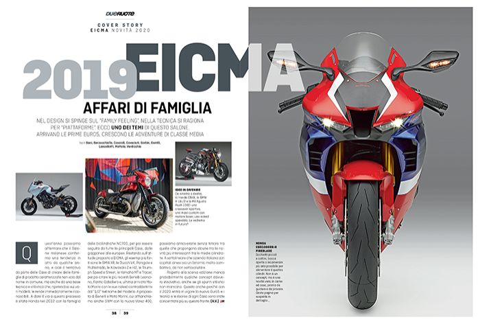 Dueruote dedica la copertina ad EICMA, l'evento motociclistico più importante dell'anno: all'interno delle pagine dedicate al Salone trovate le principali novità targate 2020, dalla sportiva Honda alle streetfighter di Ducati, Kawasaki e KTM, dalle classic Benelli Leoncino 800, Moto Morini 61/2 e Scrambler alle crossover BMW F 900 SX, Husqvarna 701 Enduro SL, Moto MORINI X-Cape e Yamaha Tracer 700. Nella sezione Moto&Scooter, invece, le prove della Honda Africa Twin, della Triumph Street Triple RS e del Sym Maxsym TL, mentre nella sezione Sport, l'avventura della Moto Guzzi Fast Endurance, raccontata dal nostro tester e pilota (per un weekend) Federico Garbin. Da non perdere l'inchiesta sugli asfalti.