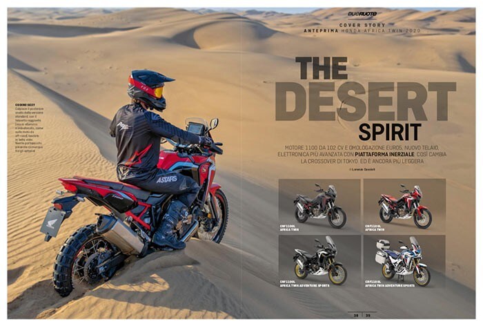 Il n 174 Ottobre 2019 di Dueruote dedica la copertina a quella che potrebbe essere una delle moto più attese del 2020, la Honda Africa Twin: motore omologato Euro5, elettronica evoluta, peso ridotto e ciclistica ridisegnata le sue novità, con sospensioni elettroniche e pneumatici tubeless esclusiva della versione Sports. A farle compagnia, le novità 2020 Harley-Davidson, Indian, Triumph, Yamaha e quella che, secondo noi, potrebbe essere la futura Suzuki V-Strom 1000. Tra le nostre prove, invece, segnaliamo la BMW R nineT /5, la Benelli Leoncino 250 e la Honda CB500X con annessa guida all’acquisto relativa alle crossover 250-500. L’adventouring (il turismo avventura in sella a una enduro) la fa da padrona nelle pagine Community, dove c’è spazio anche per l’inchiesta sulla nuova revisione moto.