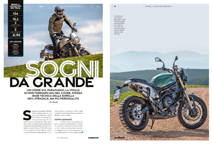 C'è tanta voglia di avventura sul numero di giugno di Dueruote, sul quale potrete trovare i test delle tre moto più attese nel settore adventouring, ossia Ducati DesertX, Yamaha Ténéré World Raid e GasGas ES700. E poi le prove di Aprilia Tuono 660 Factory, Benelli Leoncino 800 Trail, Harley-Davidson Nightster e Low Rider ST, Royal Enfield Scram 411. La sfida del mese è tra le crossover Triumph Tiger Sport 660 e Yamaha Tracer 7 GT. Tra le storie, in evidenza il record mondiale stabilito da Valerio Boni in sella a una moto da off-road, e un grande viaggio in moto tra Sudafrica e Tanzania. E poi tanto altro: mercato con la esclusiva sezione Pro dedicata agli operatori di settore, notizie, approfondimenti. Buona lettura!