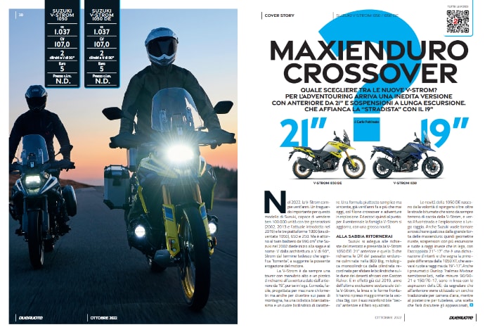 Questo mese una doppia cover per i lettori di Dueruote, dominata dalla nuova Suzuki V-Strom 1050, moto che la Casa giapponese presenta in versione crossover con ruota anteriore da 19", e in versione maxienduro DE, con l'anteriore da 21". E poi i test della redazione: Moto Morini 6 1/2, Brixton Cromwell 1200, MV Agusta F3 800 RC, Orcal Sirio, oltre che gli elettrici VMoto Stash e Super Soco S01. Ma su Dueruote trovate tante anteprime, con le attese novità 2023 di Ducati, Aprilia e Yamaha. Sfogliando il giornale c'è tanto altro, dalle inchieste sulle cause degli incidenti in moto al mercato )con la esclusiva sezione Pro dedicata agli operatori di settore, notizie, approfondimenti), passando per il turismo e lo sport. Buona lettura!