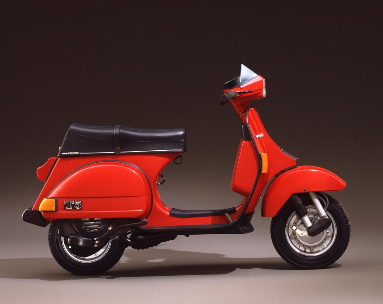Anche la serie PX trova, con la T 5, il modello “supersportivo”. Nuovo il motore, con cilindro in alluminio a 5 travasi; ma nuovo anche il design, soprattutto al posteriore e nell’area del fanale anteriore, integrato con un aggressivo cupolino dotato di un piccolo parabrezza in plexiglas. Uno spoiler arricchisce lo scudo.