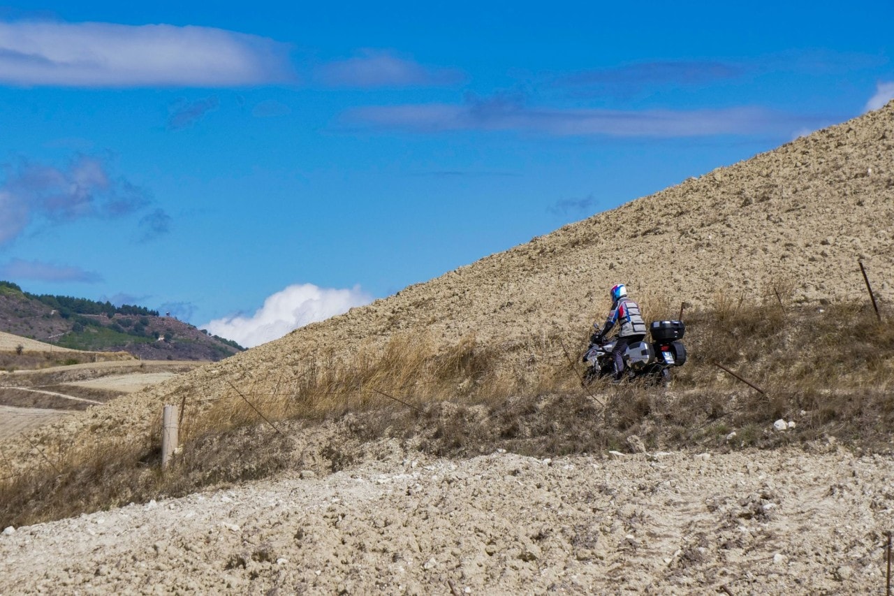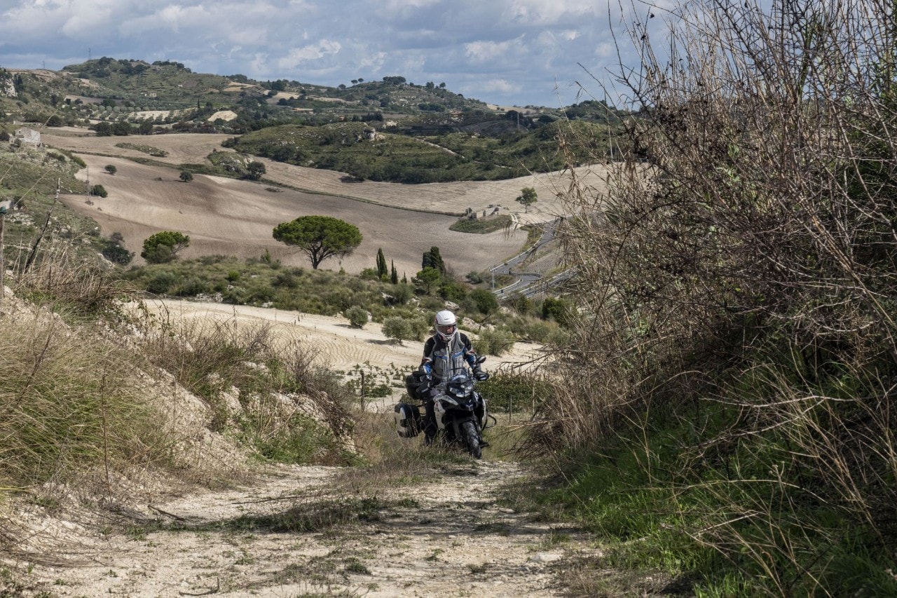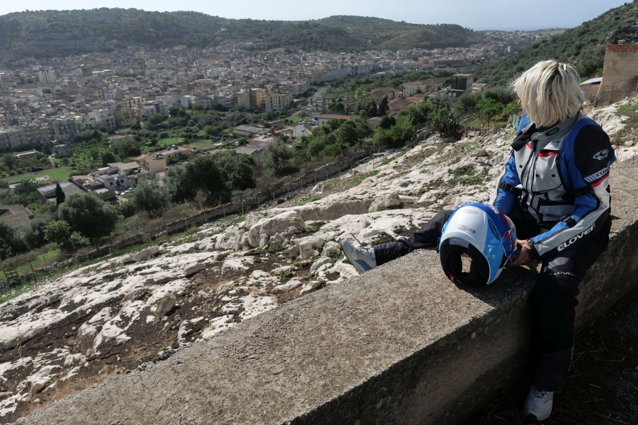 Da Ragusa è anche possibile andare alla scoperta dei paesini che caratterizzano il cuore dei monti Iblei. Giarratana ad esempio, da cui decidiamo di proseguire sulla SP57 verso Palazzolo Acreide. L’interruzione della strada quando ormai la meta è a un soffio ci spinge all’avventura: fidandoci del navigatore e dei consigli raccolti per strada, ci inoltriamo tra i campi di argilla rossastra lungo i sentieri che fiancheggiano i campi appena arati. E la Benelli TRK 502 X che abbiamo noleggiato si fa largo con onore prima di riportarci sull’asfalto che ci farà incontrare in successione Buscemi, Buccheri, Monterosso Almo e Chiaramonte Gulfi, il “Balcone di Sicilia” da cui lo sguardo può dominare tutta la vallata e spingersi fino all’Etna.