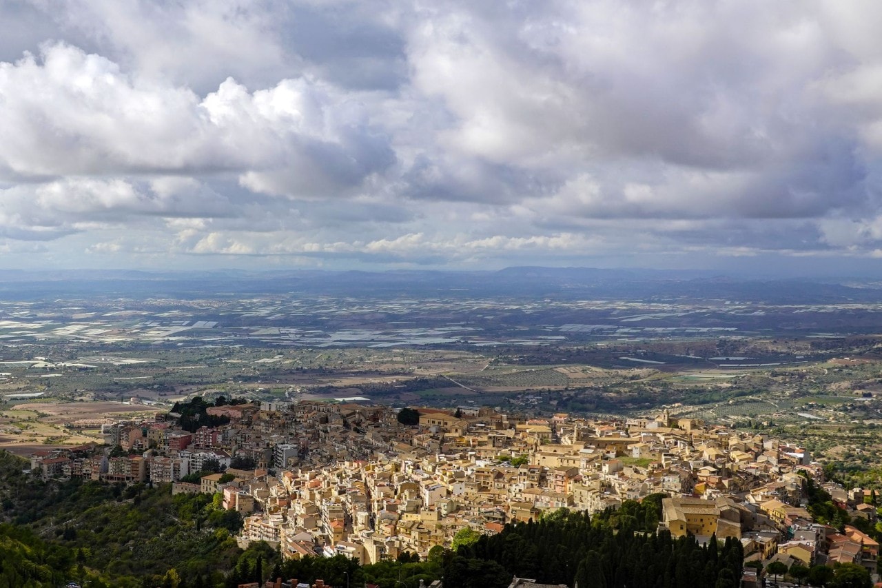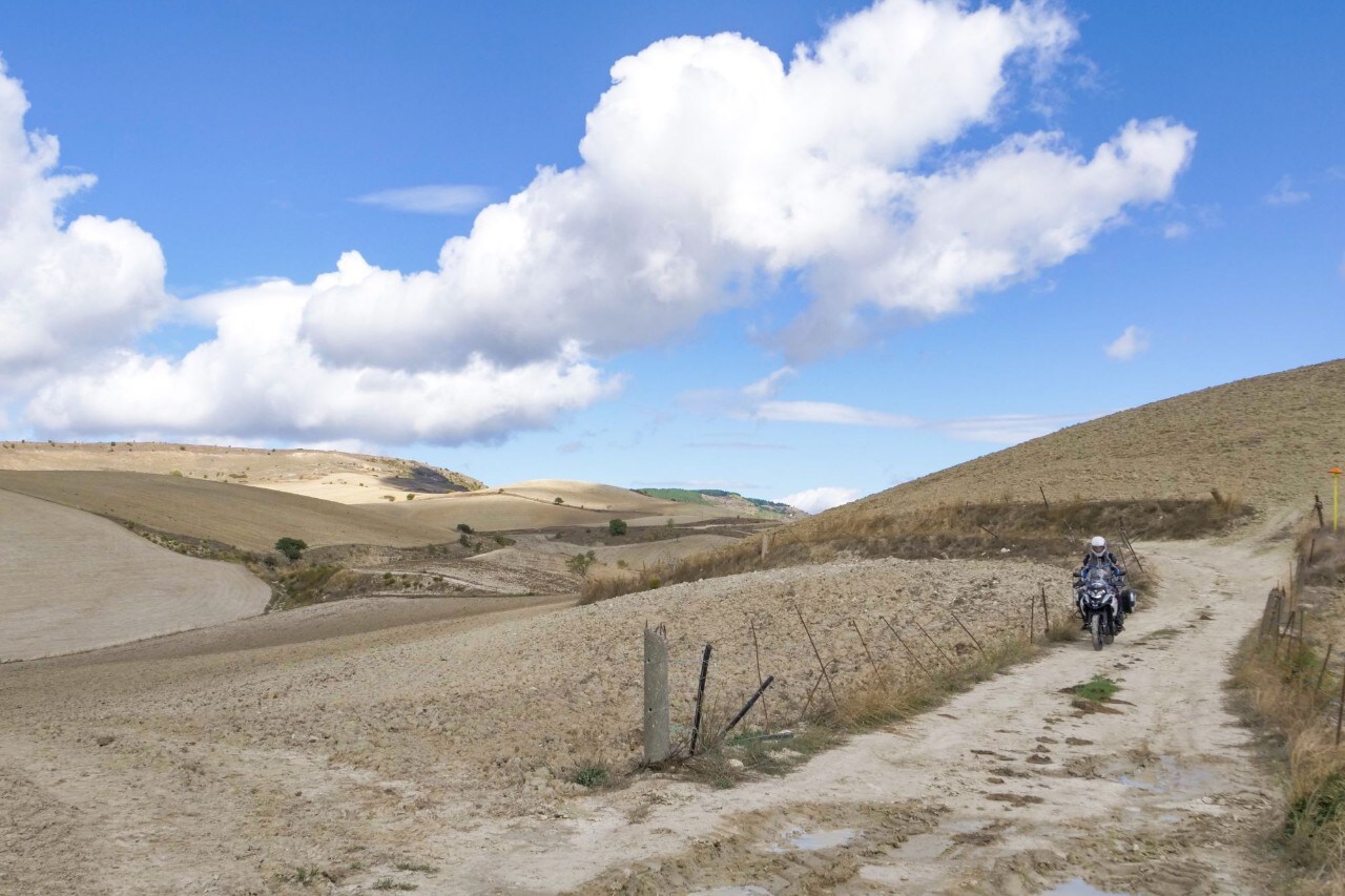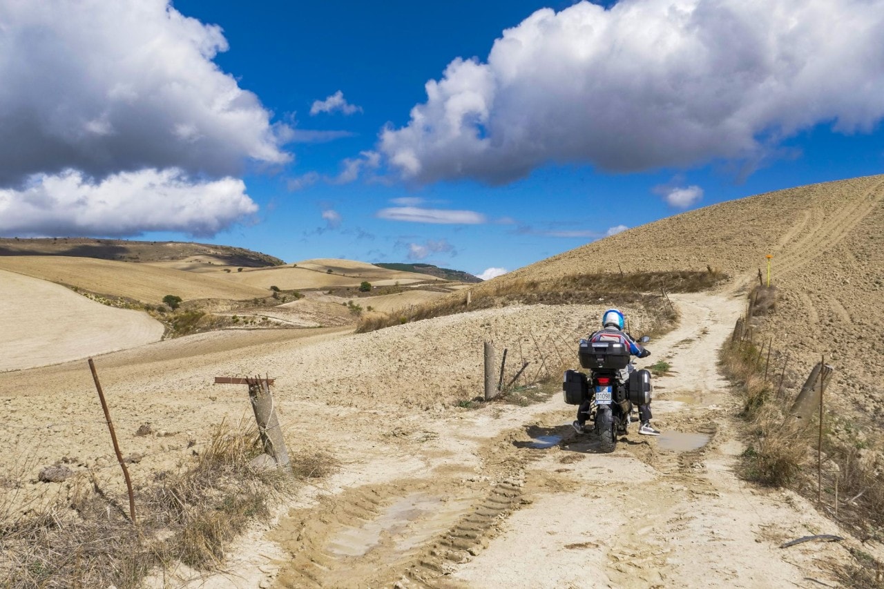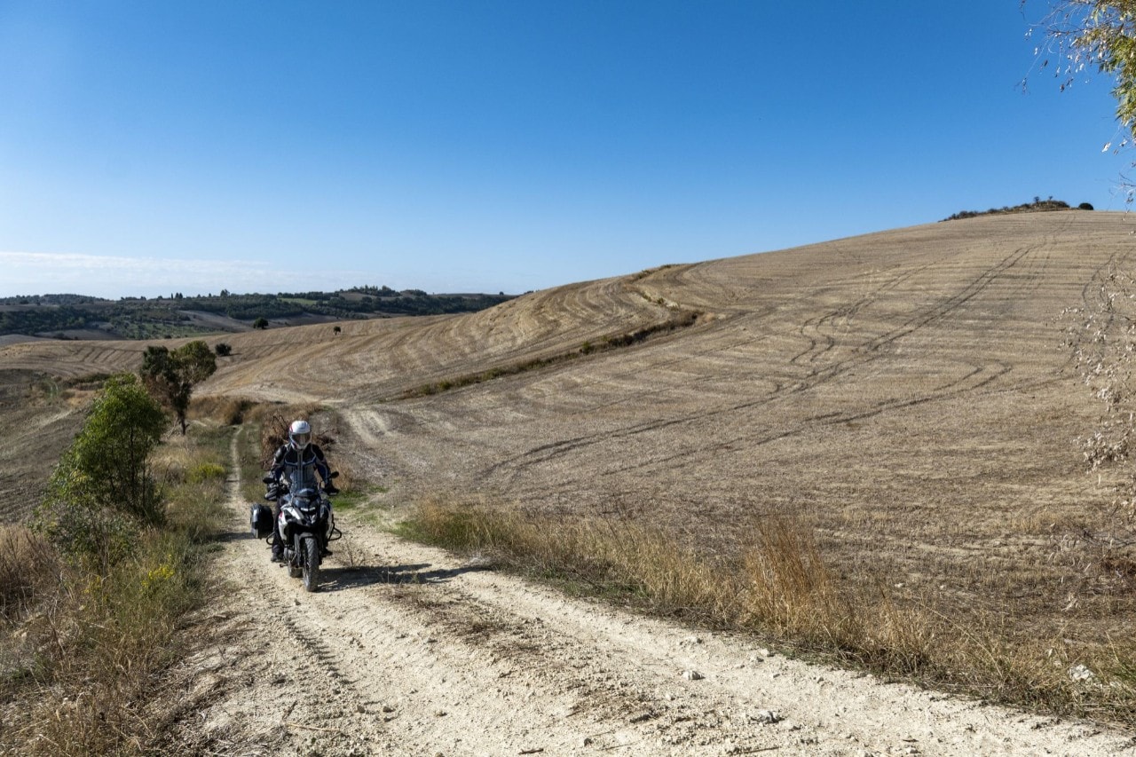 Da Ragusa è anche possibile andare alla scoperta dei paesini che caratterizzano il cuore dei monti Iblei. Giarratana ad esempio, da cui decidiamo di proseguire sulla SP57 verso Palazzolo Acreide. L’interruzione della strada quando ormai la meta è a un soffio ci spinge all’avventura: fidandoci del navigatore e dei consigli raccolti per strada, ci inoltriamo tra i campi di argilla rossastra lungo i sentieri che fiancheggiano i campi appena arati. E la Benelli TRK 502 X che abbiamo noleggiato si fa largo con onore prima di riportarci sull’asfalto che ci farà incontrare in successione Buscemi, Buccheri, Monterosso Almo e Chiaramonte Gulfi, il “Balcone di Sicilia” da cui lo sguardo può dominare tutta la vallata e spingersi fino all’Etna.