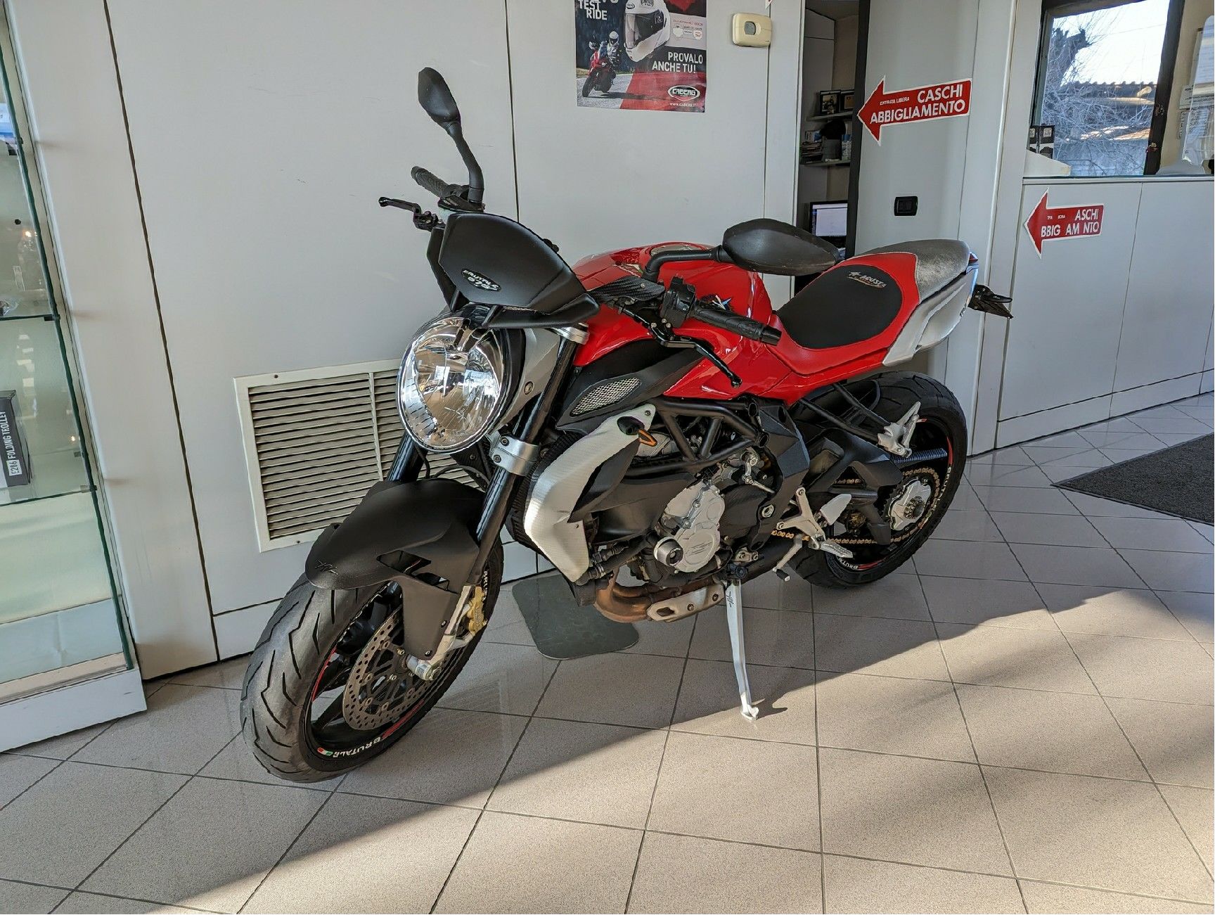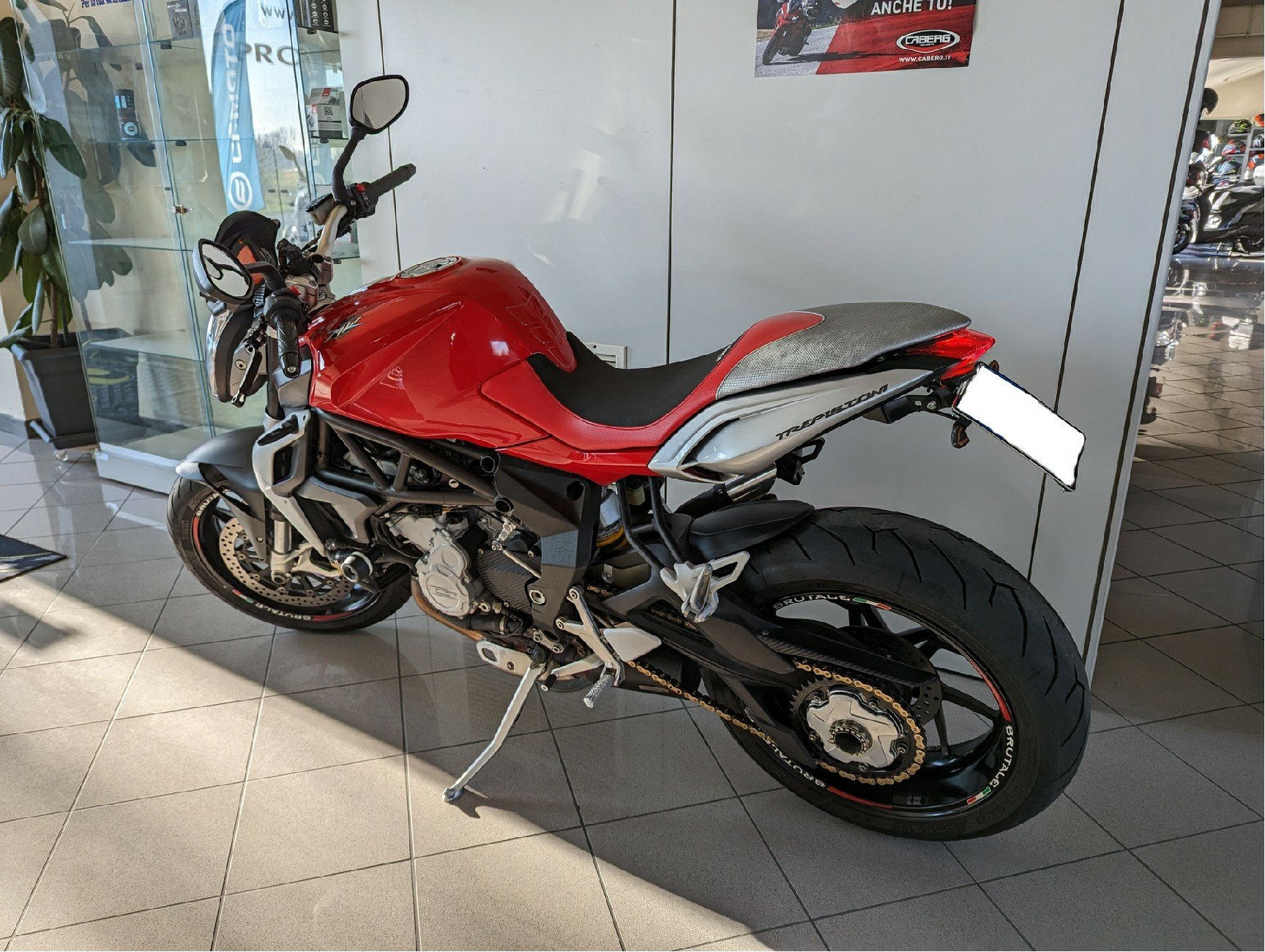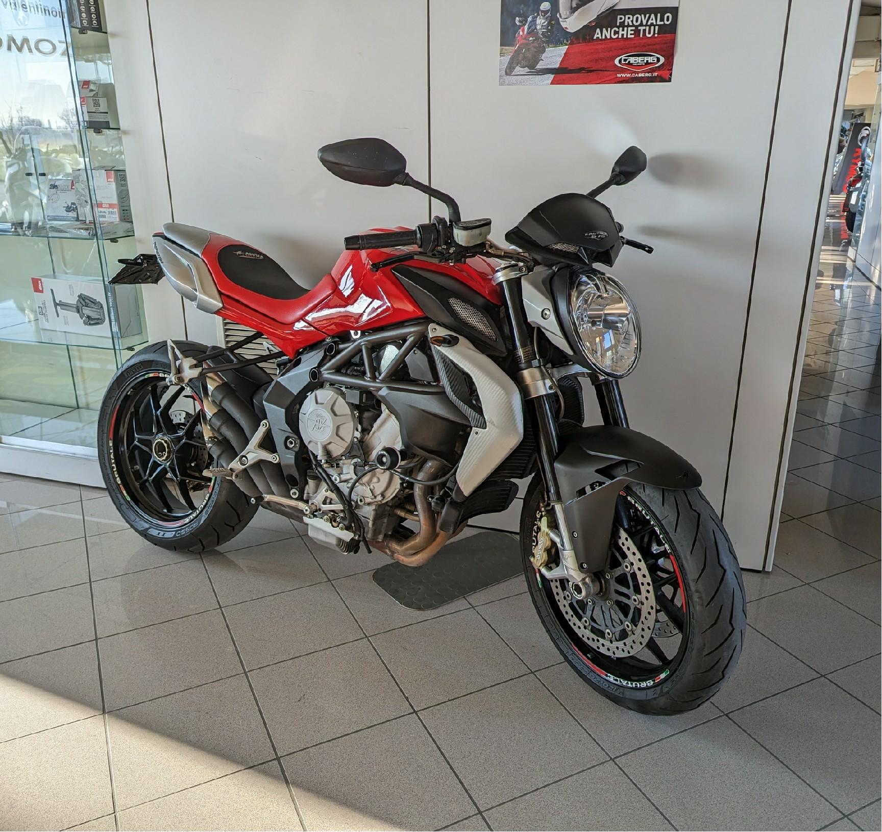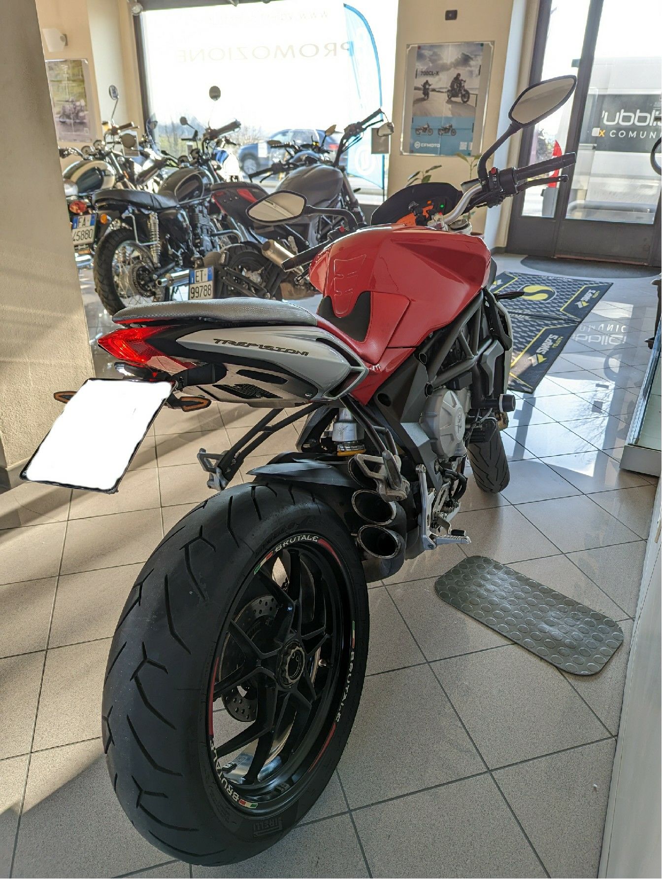 La MV Agusta Brutale 675 è una naked sportiva prodotta dal 2012 con motore tricilindrico in linea da 675 cc, raffreddato a liquido e alimentazione a iniezione, capace di erogare 81 kW (110,1 CV) a 12.600 giri/min con una coppia di 65 Nm a 12.000 giri/min, omologazione Euro 3; monta un cambio a 6 marce, trasmissione finale a catena e serbatoio da 17 litri. La ciclistica adotta un telaio a traliccio in alluminio, forcella rovesciata anteriore e forcellone monobraccio posteriore; l’impianto frenante prevede doppio disco da 320 mm anteriore e disco da 220 mm posteriore su cerchi da 17″ con pneumatici 120/70 e 180/55. Le dimensioni tecniche sono: lunghezza 2.085 mm, larghezza 725 mm, altezza della sella 805 mm, interasse 1.380 mm e peso a secco 163 kg. Nelle prove redazionali di Dueruote la Brutale 675 si è distinta per prestazioni di alto livello (0‑400 m in 11,9 s e velocità massima oltre 219 km/h), accelerazioni da 0 a 130 km/h in 5,5 s, erogazione energica ma gestibile, ciclistica precisa e finiture di pregio, risultando una delle naked tre cilindri più intriganti e ricercate del mercato dell’usato.
