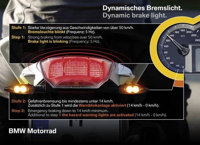 Dopo aver recentemente introdotto la tecnologia più avanzata in materia, il "Cornering ABS" efficace anche a moto inclinata (lo si trova già sui modelli dotati di Riding Modes Pro: la R 1200 GS base e Adventure e la S 1000 XR), aggiunge ora la "Dynamic Brake Light", ovvero la luce di stop intelligente.