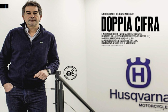 Su Dueruote di Marzo in edicola Daniele Giacometti, managing director della filiale italiana di Husqvarna illustra i grandi numeri della crescita giallo-blu: 30.700 moto vendute nel 2016 (+43% rispetto al 2015). 1.414 motocicli immatricolati in italia (+64% sul 2015). Secondo marchio nel mercato delle enduro da competizione, che ora va all'attacco anche del mondo stradale
