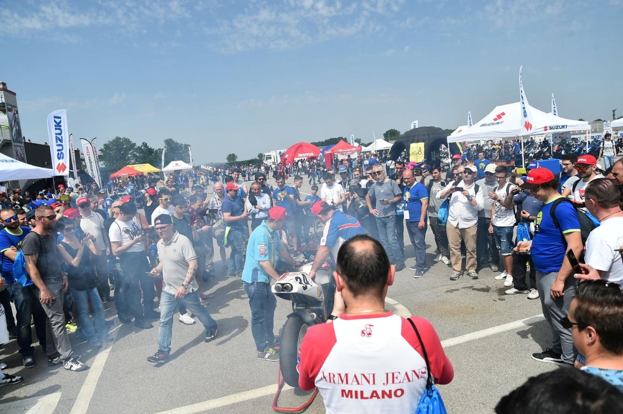 Nei 3.000 suzukisti accorsi a Cremona Circuit ci sono anche quelli con le V-Strom e quelli con le SV, con i Burgman e le Intruder, con le Hayabusa. Ma il focus è in pista. I turni si susseguono uno dietro l’altro: 100 euro per 4 ingressi. Da metterci la firma. Vecchie volpi dei cordoli si sfregano le mani. Ma ci sono anche trentenni che forse strisciano per la prima volta in vita loro una saponetta sull’asfalto. C’è un perfetto “Iannone Replica” con la tuta Ecstar nuova di zecca e il numero 29 sulla carena.Bellissima moto, faccia da bravo ragazzo, ha anche un certo stile di guida in pista. Gli manca solo la Belen. Come lui, qui al Suzuki Day ci sono ragazzi e ragazze che parlano di mappature, di controlli elettronici. Concetti ignoti ai padri cresciuti nel mito di Kevin Schwantz. Come avrebbe mai fatto il texano a entrare a ruote bloccate al Motodrom con l’ABS? Ecco, diciamolo, se c’è una generazione di ragazzi che si chiama Kevin, non è solo per colpa di Kevin Costner. E a un certo punto Schwantz arriva davvero a Cremona. Si infila la tuta, il suo inconfondibile casco. La terrazza sopra i box si riempie. E prima che lui accenda il motore del GSX-R1000 per entrare in pista, scende un religioso silenzio. Poi parte un applauso. Lungo, lunghissimo, sincero.