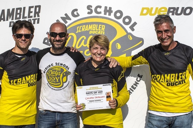 Alla fine della mattina sul piazzale ingranava le marce con decisione e si muoveva sicura in sella alla Scrambler Hashtag. Chiara ha imparato in fretta. Anche più rapidamente di allieve ben più giovani e alla prime armi come lei. Quando si dice la determinazione. Nel corso della giornata Chiara, dopo essere stata in grado di affrontare gli esercizi in pista per imparare gli stili di guida, la traiettorie e il miglior modo di affrontare le curve, e dopo aver imparato a dribblare con facilità i birilli nello slalom, ha affrontato con disinvoltura anche l’impegnativa prova di frenata sul bagnato, senza sbagliare nemmeno una staccata.