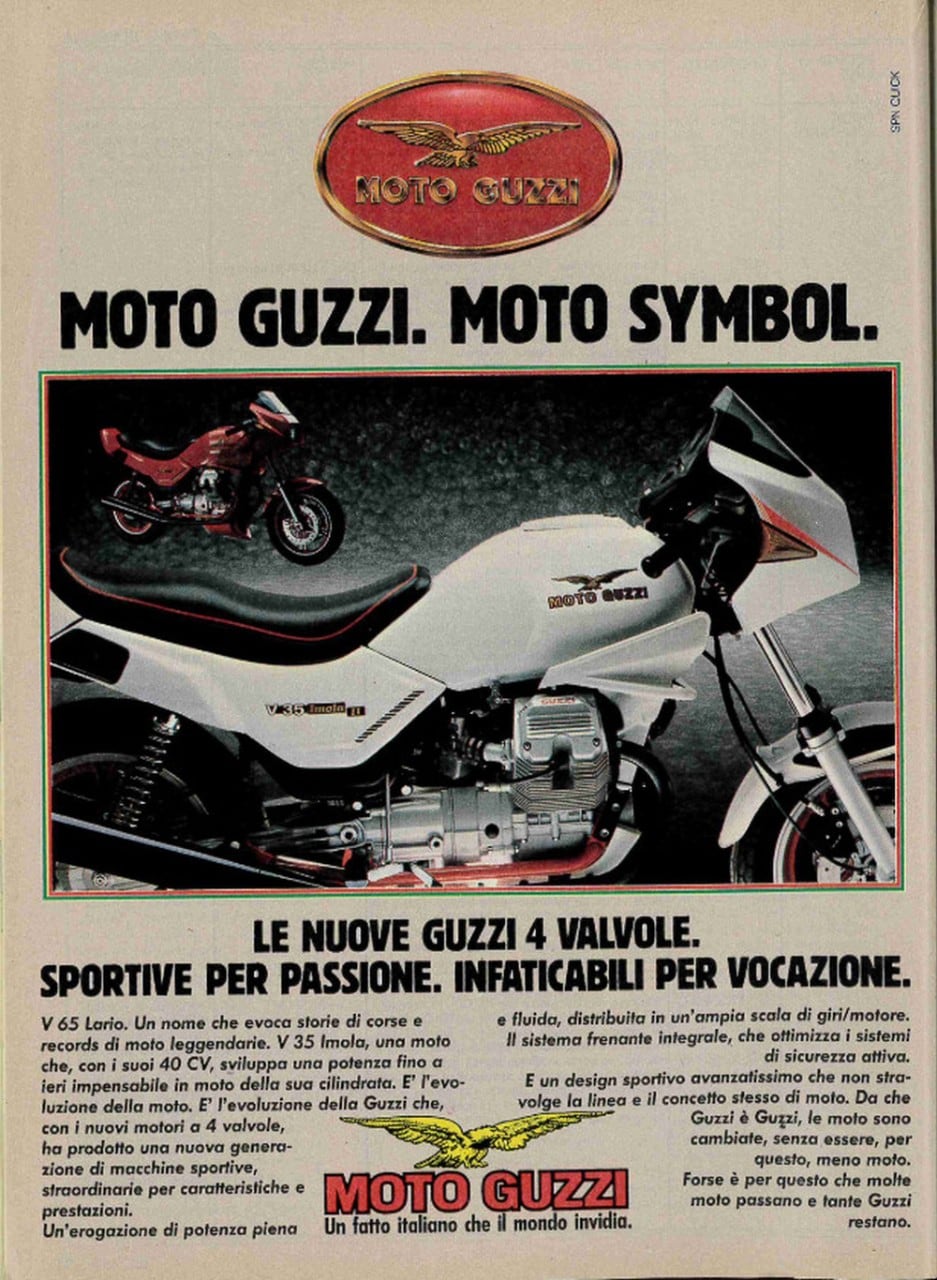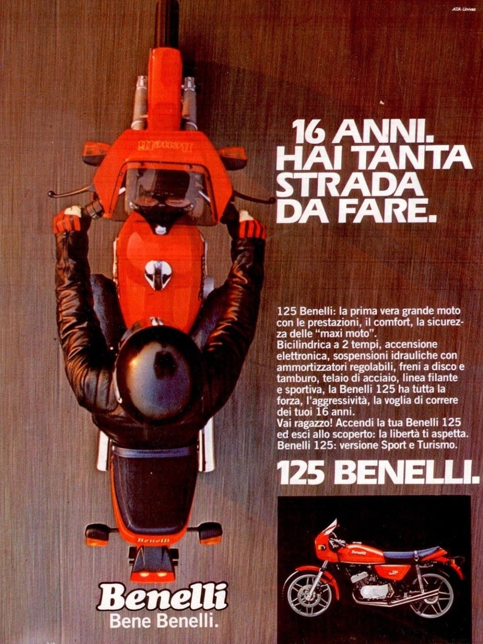 Quella mitologia a due ruote arrivava dritta dritta da noi, dalle poetiche pagine pubblicitarie di Carlo Talamo alle canzoni di Jovanotti e degli 883. Nel 1987 Edoardo Bennato cantava “OK Italia”, il cui videoclip che anticipava gli scandali di “Mani Pulite” si concludeva con una bellissima Aprilia AF1 125, presa come simbolo della rinascita del Paese. Non una Ferrari, per dire: e giustamente, perché gli italiani quelle moto le compravano davvero. Prima le 125 sportive di Aprilia, Cagiva, Gilera e delle filiali di Honda e Yamaha; poi le 600, sportive o naked; dopo ancora le maxi, sportive o custom.