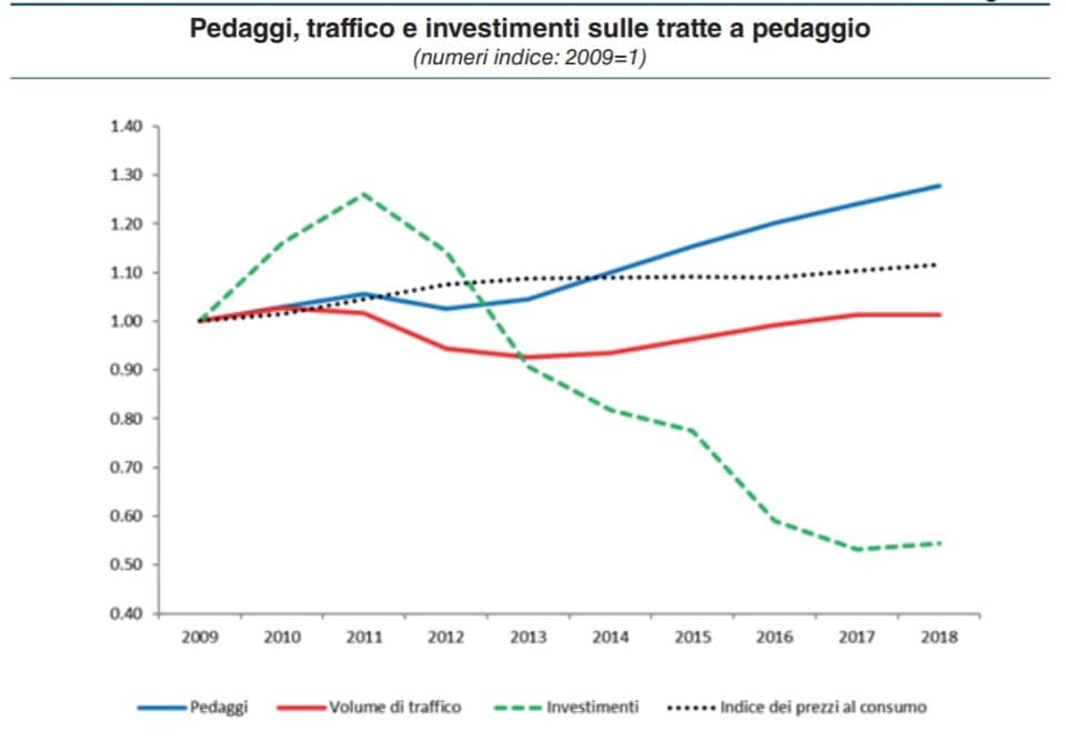 Insomma, incassi certi dai pedaggi, a fronte di investimenti in calo. Tutto “merito” del monopolio naturale che caratterizza la gestione della rete autostradale.