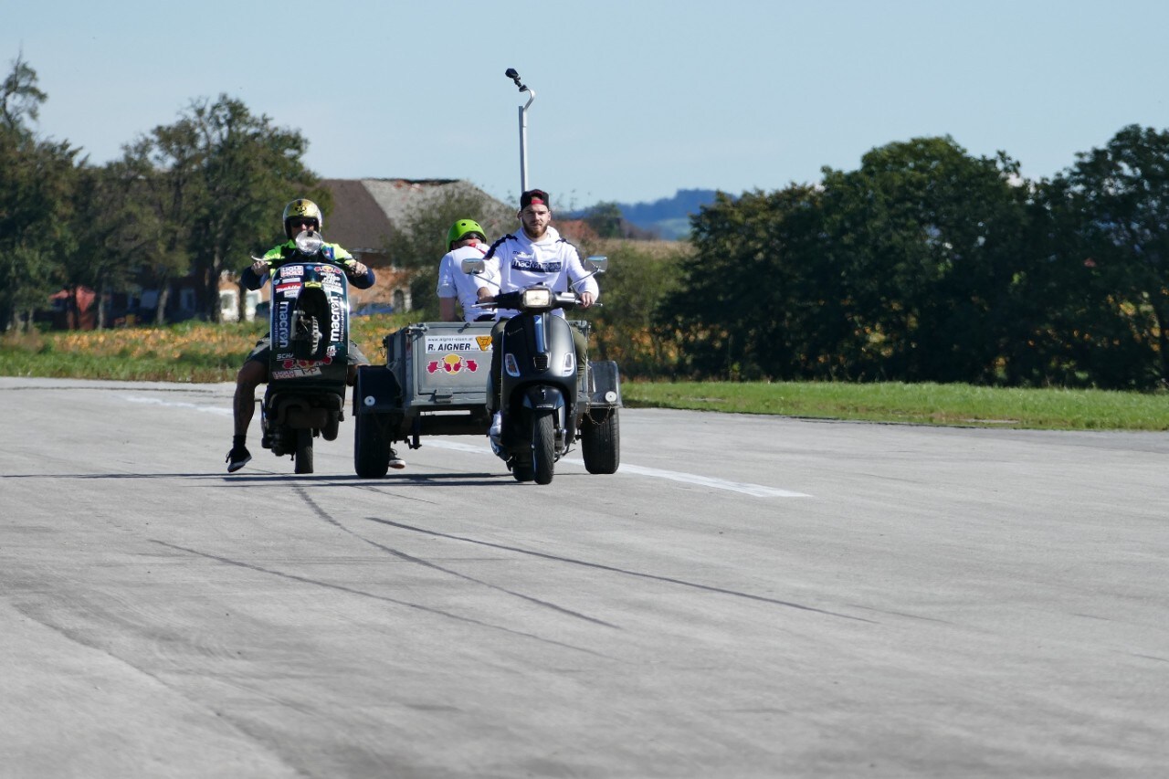 L’ultima follia è stato un cambio ruota volante… che più volante non si può. Cioè senza fermarsi. L’equipe di Schachermayr ha allestito un carrello trainato da una seconda Vespa sul quale si è sistemato un meccanico, Günter ha impennato il suo scooter e lo ha affiancato restando su una ruota sola mentre il tecnico gli sbullonava l’altra.