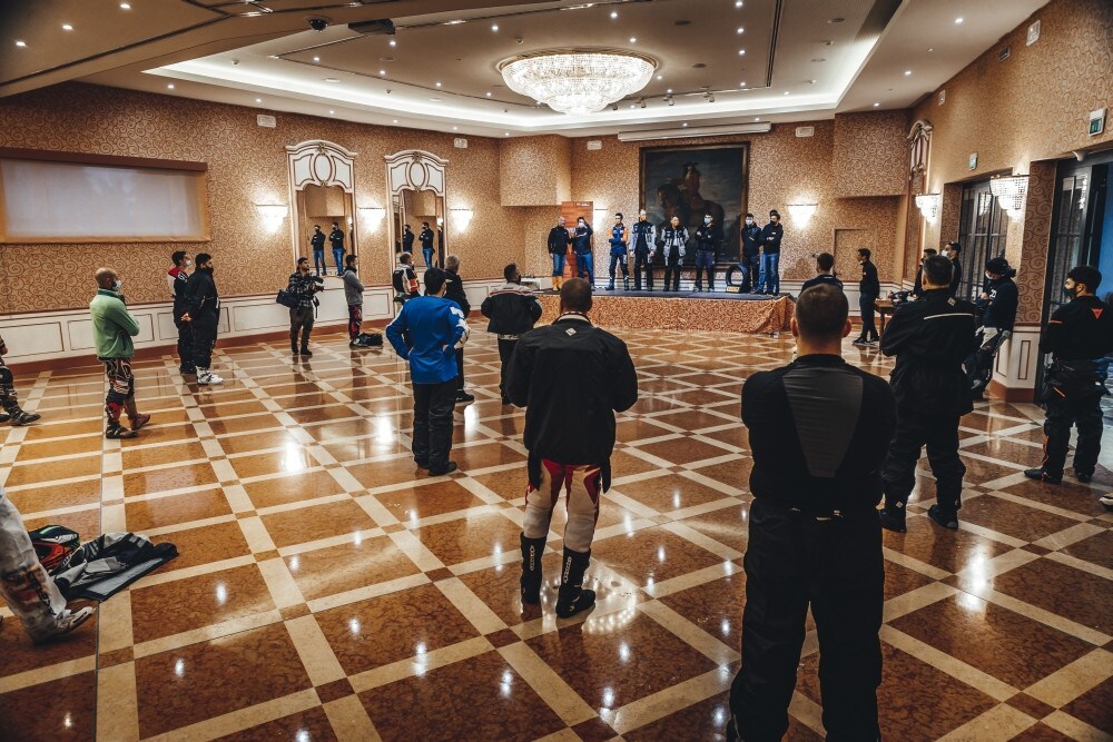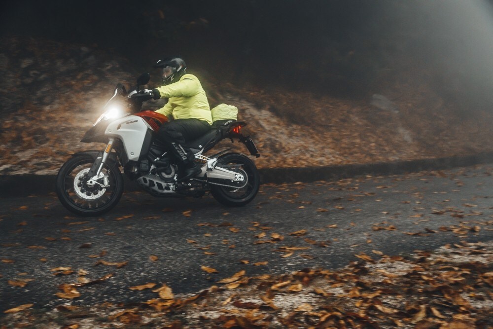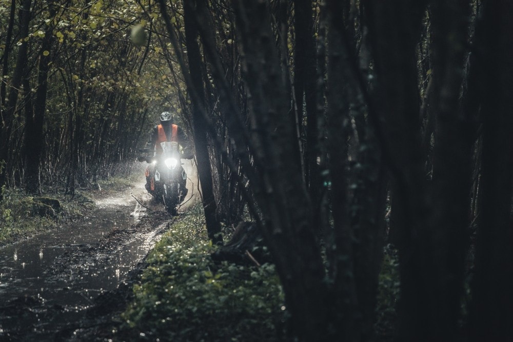 Dopo un pranzo veloce, abbiamo ripreso la nostra maratona anfibia. Sono tornata a bordo della 790 Adventure, con cui ho affrontato il percorso off-road. Qui, a detta di chi vi è transitato nel primo turno, si sono presentate alcune insidie non semplici da superare: ammetto di aver provato una leggera ansia, alimentata dalla consapevolezza che, al mio passaggio, avrei trovato un fondo ancor più viscido e fangoso a causa dell’incessante diluvio. La nostra sorte è stata affidata a Jordy e ai suoi consigli elargiti prima e durante il percorso: strade bianche totalmente allagate, sentieri trasformati in paludi, viscidi sassi smossi e infide radici. Un vasto assortimento di passaggi tecnici in cui il carisma e l’esperienza della nostra guida hanno fatto la differenza per consentirci di superare le difficoltà. Credo di essermi innamorata della 790 Adventure mentre mi rendevo conto di quanto efficace fosse nel tirarmi fuori dalle peggiori trappole. Nemmeno le sbandate secche in mezzo al fango hanno rappresentato un reale problema potendo disporre di un traction control, non invasivo e anzi, di grande aiuto. Ma un doveroso riconoscimento va tributato anche alla gomma semitassellata di Pirelli.