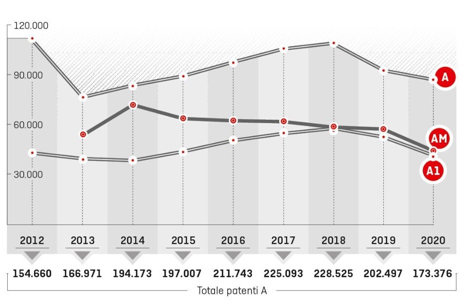 La tendenza al calo riguarda tutte le tipologie di licenza. Ma se le A “piene” sono calate di poco (58.061 nel 2020, 59.615 l’anno prima), sulle altre il segno meno è chiaro. Le A2 sono passate da 33.100 a 28.583, le A1 da 52.460 a 43.011, le patenti AM per i ciclomotori addirittura da 57.322 a 43.721. A conti fatti, il mondo delle due ruote è tornato a livelli di poco superiori a quelli del 2013.