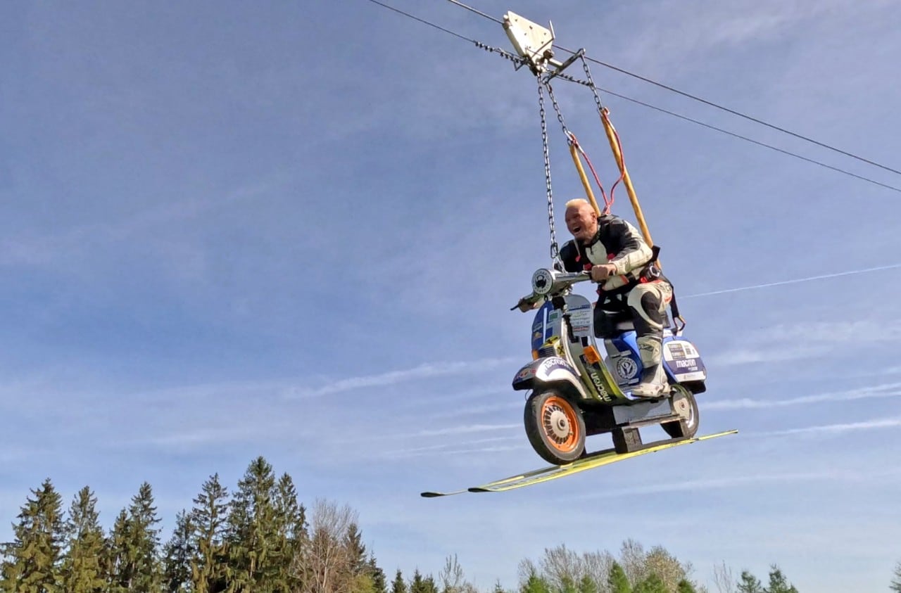 Günter Schachermayr, lo stuntman austriaco protagonista delle più folli imprese in sella a una Vespa, è costantemente all’inseguimento di nuovi primati da inserire nel Guinness Book of World Record. Chi ha buona memoria lo ha visto paracadutarsi da un aereo, volare agganciato a una mongolfiera o protagonista di un pendolo da brivido appeso nel vuoto dal bordo di una diga, e altro ancora, sempre in sella al fido scooter. Da un po’ di tempo non se ne sentiva parlare e invece stava solo preparando l’ennesima performance: un volo da un trampolino solitamente usato per le gare di salto con gli sci.
