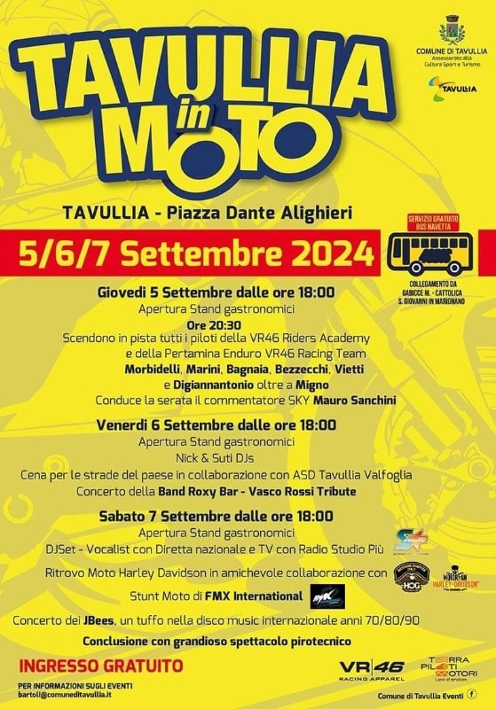 Con "Tavullia in Moto" scendono in pista i grandi campioni della MotoGP, tra cui Bagnaia, Vietti, Morbidelli, Marini, Di Giannantonio, Bezzecchi. E poi il raduno delle Harley Davidson e agli stunt di FMX International