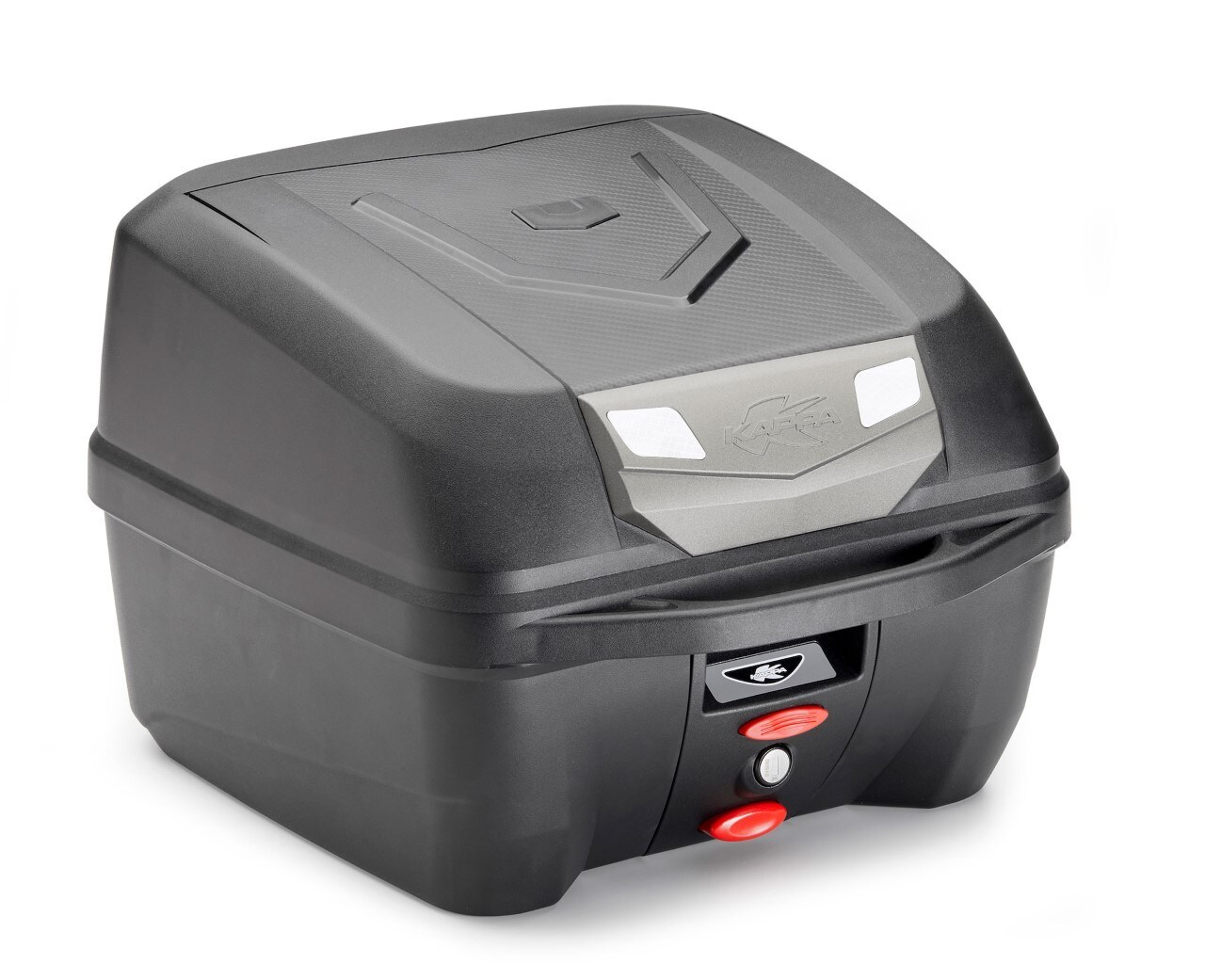 Capace di contenere comodamente un casco integrale o modulare, oltre ad altri utili oggetti e accessori di uso quotidiano, questo modello da 32 litri riesce a conciliare dimensioni piuttosto ridotte con un ampio spazio interno. Cattura l’attenzione l’inserto superiore verniciato in color argento satinato con il logo, che sostituisce i catadiottri e “spezza” il nero del fondo. Il coperchio è impreziosito da una texture effetto carbonio. Comodo il maniglione per il trasporto a mano. Da segnalare è anche la presenza del sistema “Micro 3”, che permette la chiusura del bauletto, senza l’uso della chiave, semplicemente esercitando una pressione sul coperchio. Di serie piastra e kit universale per il montaggio sul veicolo.
