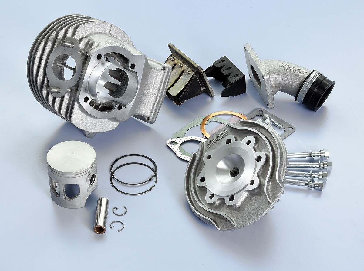 Il kit con immissione “Evolution lamellare” nel cilindro viene fornito completo di: cilindro, pistone, testa, pacco lamellare, collettore d’aspirazione e serie guarnizioni.