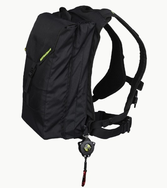 Nella parte posteriore, difatti, si trova un airbag ad attivazione meccanica con un sacco da 15 litri di capienza, che si gonfia ijn caso di necessità in 80 millisecondi. L'attivazione avviene attraverso il sistema Fastlock, un brevetto di Motoairbag che ha il vantaggio oggettivo di riconoscere ogni situazione di pericolo. Il cordino deve essere allacciato ogni volta alla moto o allo scooter. Lo zaino è dotato di spallacci e di due fasce anteriori regolabili con chiusura a clip, che è opportuno agganciare in modo tale che lo zaino stesso aderisca bene alla parte superiore del corpo del motociclista.