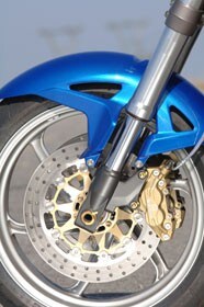 I freni anteriori sono due dischi da 298 mm su cui agiscono pinze a quattro pistoncini. La leva della frizione, che si aziona senza troppa fatica, non prevede nessuna regolazione. Il forcellone è realizzato in estruso d’acciaio dalla sezione semi-ovale e su di esso è montato un comodo registro a slitta per la regolazione della tensione della catena. I cerchi sono da 17'' e calzano pneumatici Pirelli Diablo.
