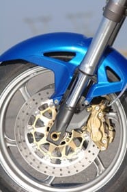 La leva del freno anteriore regolabile nella distanza su quattro posizioni, comanda le pinze marchiate Brembo che mordono i due dischi anteriori che garantiscono una risposta pronta, ma mai tale da mettere in difficoltà il pilota, stesso discorso per il freno posteriore.