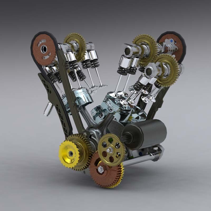 Per contenere il più possibile le dimensioni del propulsore – specie nella zona di passaggio delle travi - il sistema di distribuzione impiega due catene che azionano un solo ingranaggio per bancata al posto dei canonici due, vincolato all'albero a camme di aspirazione: l'albero a camme di scarico è messo in rotazione da una coppia di ingranaggi (in giallo) posta centralmente alla testata stessa.