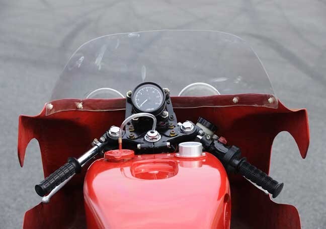 Come se non bastasse, l'azionamento del comando del gas richiede una rotazione particolarmente lunga. Inizialmente, pensavo che ciò fosse dovuto al comando compreso nel kit di elaborazione Japauto, riconoscibile attraverso il marchio dell'azienda francese impresso sulla manopola destra. Invece, ho poi scoperto che Patrick Massé ha montato un comando Japauto stradale, caratterizzato da una risposta più progressiva che avrebbe dovuto facilitare la guida della moto, anche se in realtà, durante il test sono dovuto rientrare ai box varie volte perché la manopola tendeva a scivolare sul comando! Una volta sistemata definitivamente, l'acceleratore risultava comunque troppo lungo, oltre che duro, rendendo difficoltose le operazioni anche in fase di scalata, quando si è soliti dare un piccolo colpo di gas tra una marcia e l'altra. Dove viceversa la Japauto-replica fa davvero la differenza è a livello di feeling generale. La moto appare infatti compatta e ben costruita, e il merito va tutto a Patrick Massé che l'ha resa tale. Anche se negli anni Settanta era ancora all'inizio del suo sviluppo, la Japauto rappresenta un mezzo lungimirante, tanto efficace quanto distintivo a livello di design. Di moto così, non ne fanno più!