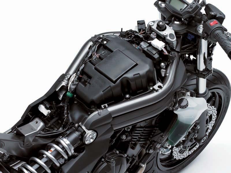 Ma torniamo alla moto. Il design della nuova ER6-n diventa decisamente più aggressivo rispetto al passato, grazie a un nuovo faro anteriore sfaccettato, cupolino piccolo e oscurato e il codino più corto e appuntito. Linee taglienti e "cattive" come non te le aspetteresti, cui fa il paio una ciclistica inedita. Il telaio ora è a doppio tubo perimetrale e oltre a svolgere una importante funzione di design contribuisce a rendere la moto più snella e leggera grazie all'accentramento delle masse.