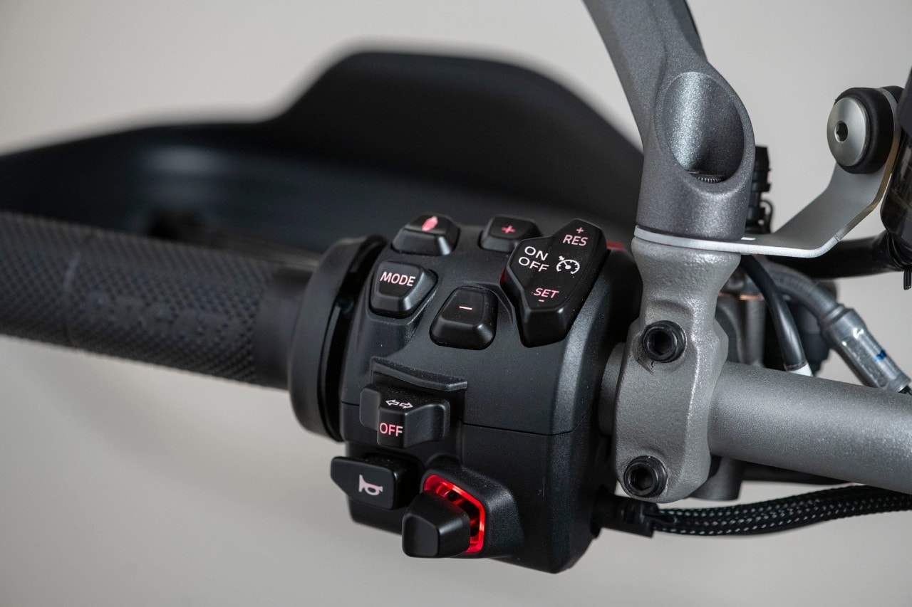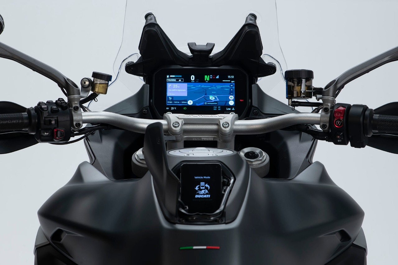 Sempre le S offrono anche il nuovo display TFT da 6,5" (anziché 5") e con vetro minerale come gli smartphone: mostra il settaggio delle sospensioni e la mappa del navigatore grazie all’app dedicata Sygic GPS. A controllarlo provvede una nuova interfaccia con joystick sul bracciale sinistro, mentre il telefono può essere tenuto a portata di mano e sotto carica in un vano sulla sommità del serbatoio.