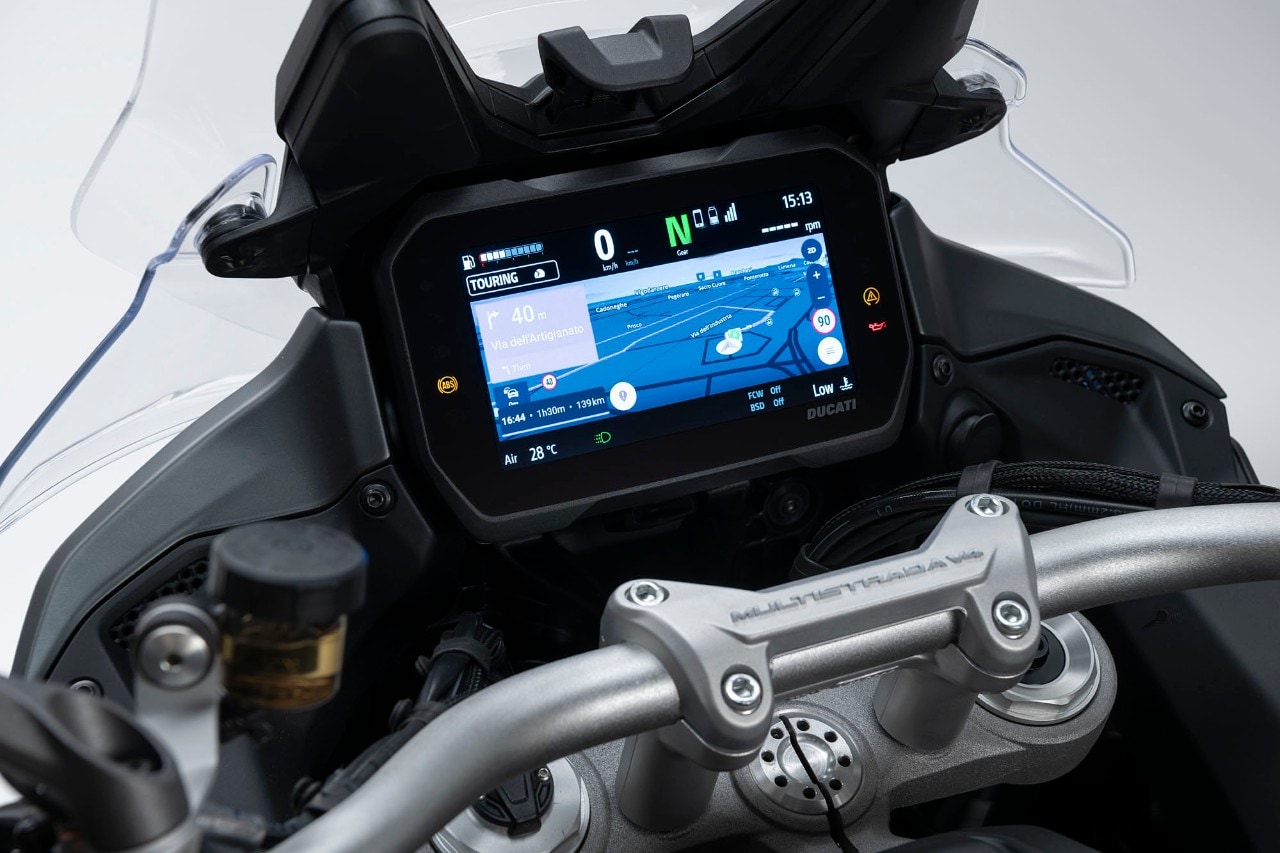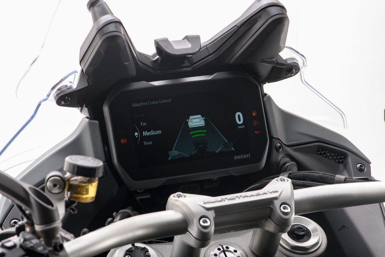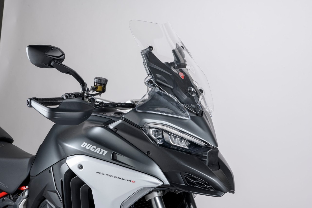 Ferma restando la sportività assicurata dal V4 da 170 CV a 10.500 giri/min e dall’indiscusso know-how Ducati, la grande attenzione riservata anche a comfort e protettività emerge nel plexi, regolabile in altezza con un solo dito e associato a due deflettori laterali: il tutto affinato in galleria del vento, come pure i deflettori inferiori che allontanano il calore e riparano le gambe dagli spruzzi. La parte frontale della moto aggiunge alle luci full LED e cornering (ora con la stessa firma ottica della Panigale V4) il radar integrato del cruise control adattivo ACC, un'altra primizia di questa Multistrada V4. Un secondo radar montato posteriormente offre invece il sistema Blind Spot Detection per il controllo degli angoli ciechi e che si avvale di un brevetto depositato da Ducati con il Politecnico di Milano.