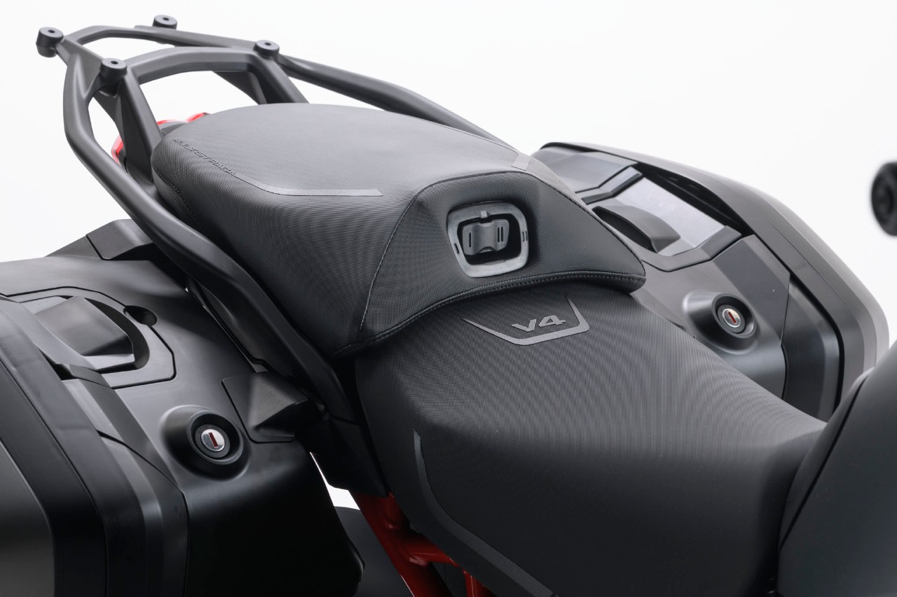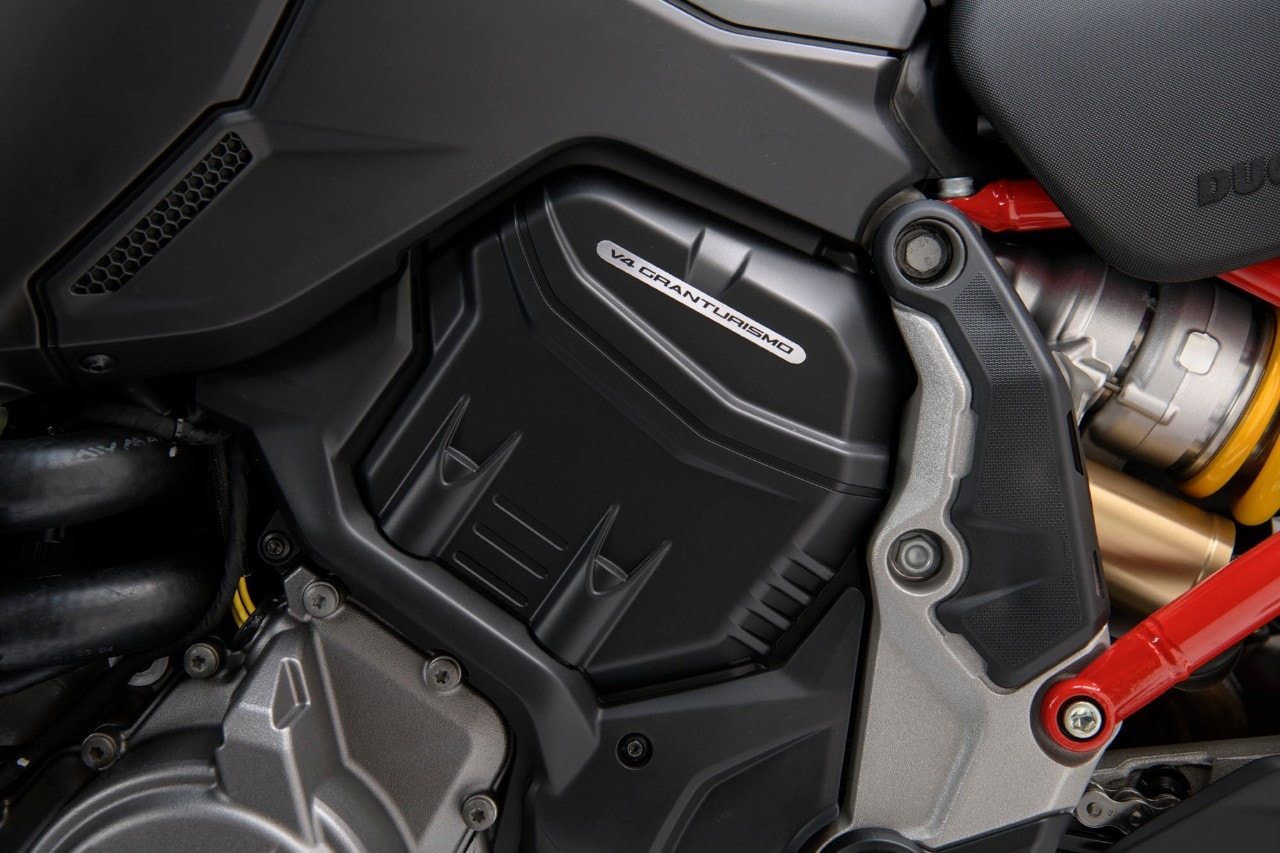 Le forme sono insomma cambiate più di quanto sembri. Il becco è più corto, la coda è più snella, la parte centrale è più imponente (anche perché il serbatoio lievita da 20 a 22 litri) e in generale tutta la moto è meno raccordata, alla ricerca di un sapore più rude. La nuova Multi V4 si allontana quindi dalle forme fluide e stradali della precedente 1260 per avvicinarsi all’aspetto più "off" di una BMW R 1250 GS Adventure, per esempio: come parrebbero indicare il traliccio del telaietto reggisella a vista, la sella corta che non abbraccia più il serbatoio e le forme meno sviluppate in orizzontale e più in verticale.
