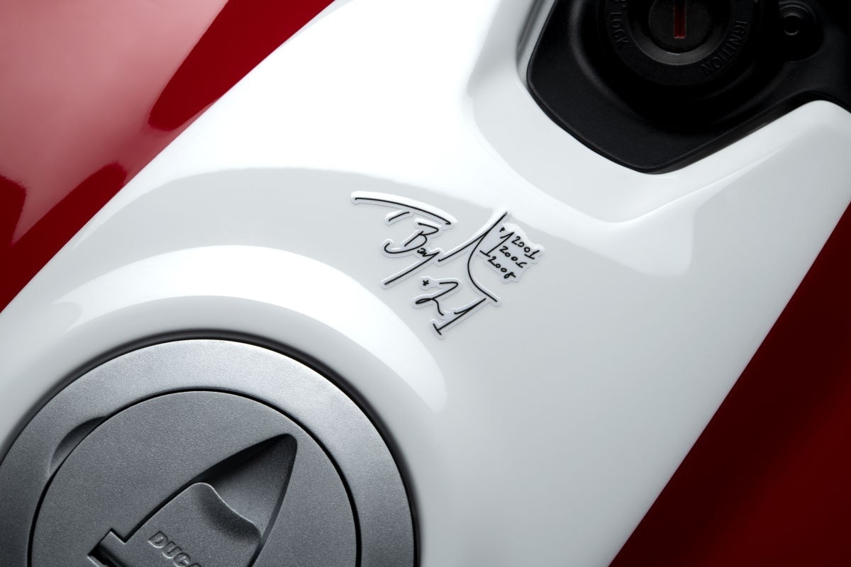 Realizzata partendo dalla base della Panigale V2, la versione “Bayliss 1st Championship 20th Anniversary” si caratterizza per la speciale livrea , la cui grafica si ispira a quella della 996 R che nella stagione 2001 ha accompagnato Bayliss alla conquista del suo primo titolo mondiale, rivisitandone colori e tagli. Il rosso Ducati è il colore principale della moto e si unisce al verde e al bianco in un tributo all’italianità della Casa motociclistica bolognese, mentre sui lati e sul frontale spiccano l'iconico n°21, numero di gara di Troy Bayliss, e il logo Shell, che rafforzano visivamente il legame con la moto da corsa. Sul serbatoio è riprodotto l’autografo di Troy, mentre sulla piastra di sterzo in alluminio ricavata dal pieno sono riportati il nome della moto e la numerazione progressiva di questo modello unico.
