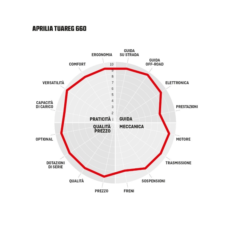 La posizione di guida in piedi è molto valida, e tra geometrie e sostegno delle sospensioni ce n’è a sufficienza per avventurarsi anche in percorsi “brutti” dove con altre bicilindriche verrebbe voglia di tornare indietro. È appena meno dotata della più specialistica Yamaha Ténéré 700, forte di una rapportatura anche più corta; ma l'Aprilia è comunque al top per capacità fuoristradistiche. Magari sulla terra serve meno, ma su strada la Tuareg offre poi un pacchetto elettronico completissimo, a differenza della Yamaha che ha solo l’ABS disinseribile. Qui ci sono il ride by wire, le mappe motore, il traction control e regolazioni anche per il freno motore, oltre all’ABS disinseribile selettivamente.