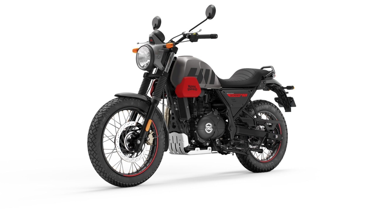 La base tecnica conta invece sullo stesso telaio monotrave sdoppiato in tubi di acciaio, e anche la corsa delle sospensioni è praticamente la stessa: scende da 200 mm a 190 mm per la forcella tradizionale con parasteli a soffietto e resta di 180 mm al posteriore, gestito da un monoammortizzatore centrale montato con leveraggi. Anche l'altezza sella è praticamente invariata: 795 mm per la Scram 411 contro 800 per la Himalayan. Identico anche l'impianto frenante con due dischi (300 mm anteriore e 240 mm posteriore) e ABS a due canali, qui però non disinseribile al posteriore come sulla più enduristica Himalayan. Sempre snelle le ruote con un 90/90 anteriore e un 120/90 posteriore.