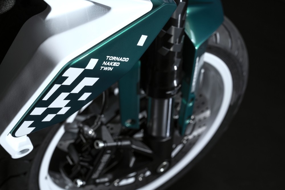 La ciclistica della Tornado Naked Twin 500 è affidata ad un telaio a traliccio in tubi in acciaio. Si tratta di una moto molto compatta ed agile, anche grazie ad un interasse di soli 1451mm, in grado di garantire fluidità e velocità nei cambi di direzione. Il reparto sospensioni è affidato ad una forcella upside-down con steli da 50 mm, con un’escursione di 125 mm ed un forcellone oscillante con monoammortizzatore centrale regolabile nel precarico molla e freno in estensione, con una escursione di 41,2 mm. L’impianto frenante è invece affidato all’anteriore ad un doppio disco semiflottante da 320 mm di diametro con pinza radiale a quattro pistoncini ed ABS, mentre al posteriore ad un disco di 260 mm di diametro con pinza flottante a singolo pistoncino ed ABS. I cerchi da 17”, in lega di alluminio, proposti in colorazione bianca, montano rispettivamente pneumatici 120/70 e 160/60, garantendo massima sicurezza anche nelle situazioni più difficili. Il serbatoio ha una capacità di 14 litri.