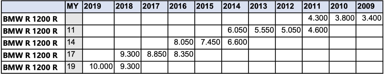 I prezzi dell’usato certificati Dueruote Professional che abbiamo preso in considerazione sono quelli dell’ultimo decennio di produzione della R 1200 R, dal 2009 al 2019. Accanto ai valori effettivi in euro, abbiamo analizzato il valore residuo percentuale, ovvero quanto ogni annata della moto vale in rapporto al costo da nuova. Riprendiamo quindi subito i prezzi di listino dell’epoca: 12.400 euro sino al 2011, saliti con il tempo a 13.950, poi a 14.100 e infine a 14.250 con l’ultimissima versione del 2019.