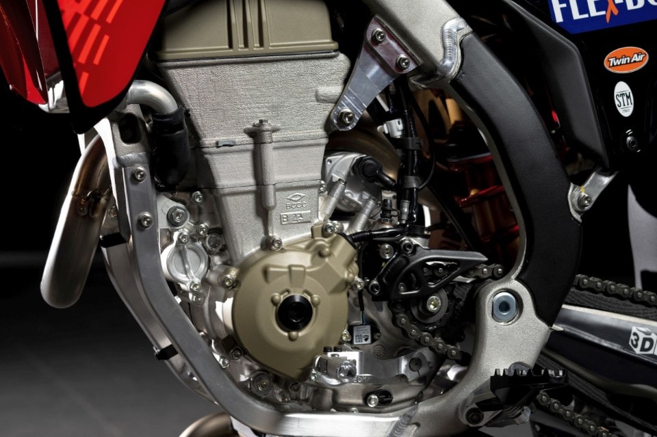 Sia Honda che KTM hanno motori monoalbero, che consentono di realizzare teste più basse e propulsori complessivamente più leggeri, favorendo il posizionamento nel telaio; dopotutto, in 450 la potenza massima non è un problema. A Bologna hanno deciso di avere, per motivi sia tecnici che di immagine, un bialbero con distribuzione Desmo, quindi con uno sviluppo importante della testa e qualche etto in più di peso. Questo ha comportato tutta una serie di altre scelte per ridurre le masse, in particolare quelle in rotazione: un contralbero più piccolo di quello Honda e ingranaggi multifunzione per azionare insieme, ad esempio, contralbero e pompa dell’acqua (i dettagli non sono ancora disponibili).