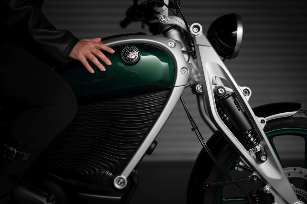 Il primo modello, denominato C6, combina un'estetica retro-futuristica con tecnologie di punta, come una forcella in alluminio forgiato e un quadro strumenti touchscreen. Curioso lo stile e la scelta ciclistica di adottare una forcella a schema Girder (molto anni 40, in effetti).