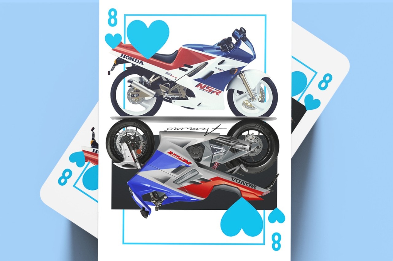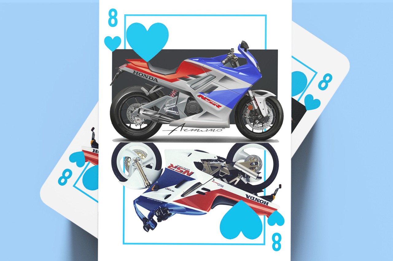 La moto piace soprattutto nella colorazione “tricolour” in stile HRC, che Giuseppe riprende per la sua versione che mantiene il caratteristico “ponte” tra serbatoio e cupolino, ma non i pittoreschi cerchi con le tre razze ad evolvente. Anche il bianco lascia il posto al grigio sia sulle carene che nel telaio. Non potrebbe più chiamarsi NSR, o forse sì vista la flessibilità con le sigle che Honda ha mostrato negli ultimi anni.