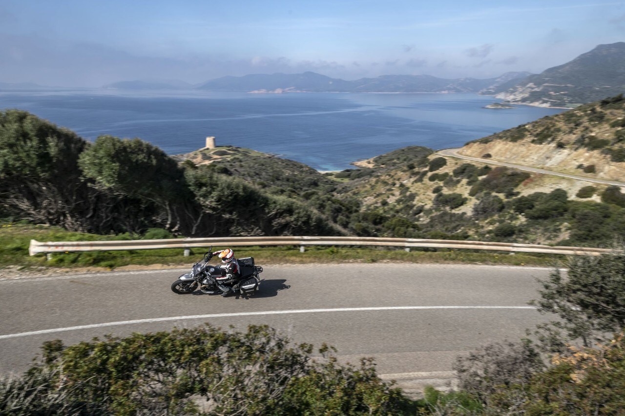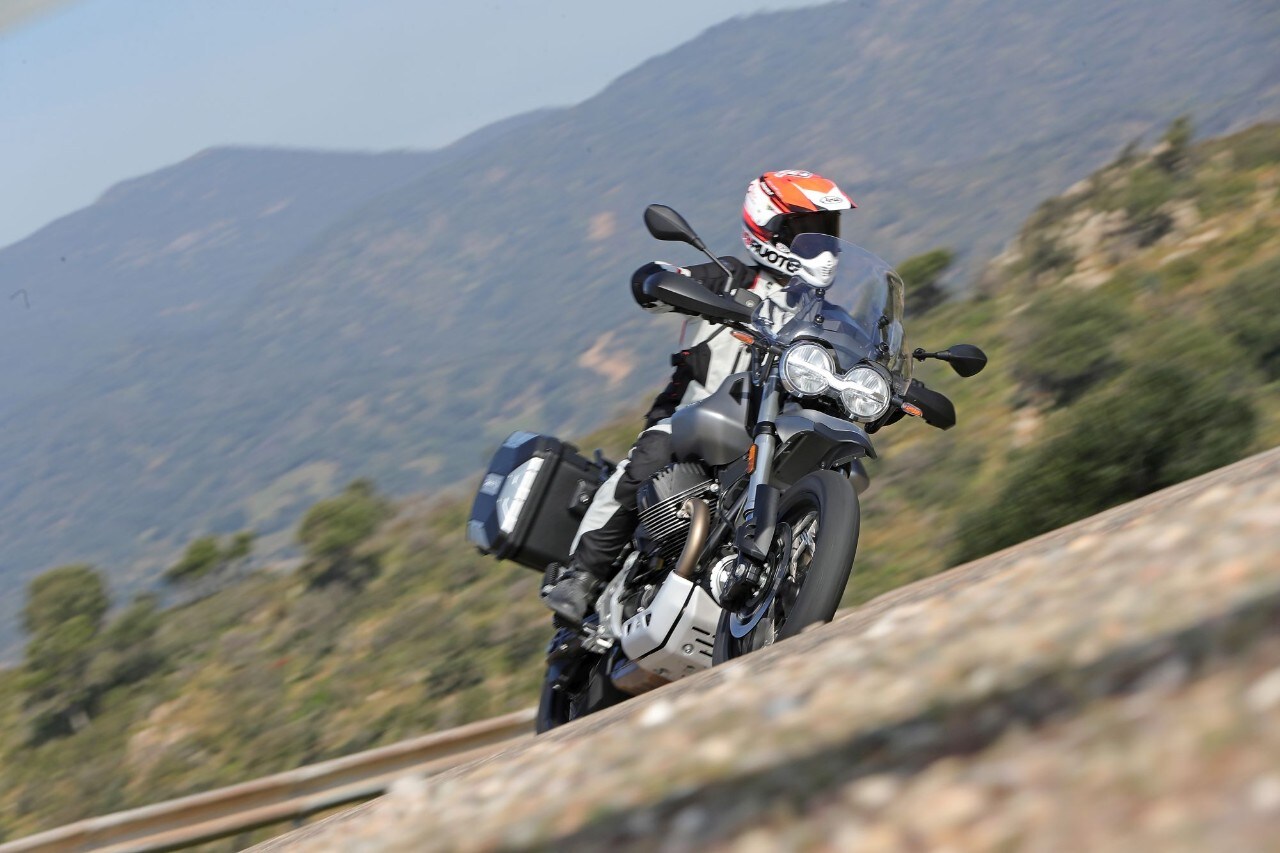 In tutte le colorazioni, la moto di serie si presenta già molto ricca di accessori come il cruise control, la porta USB, gli indicatori di direzione a led. Dietro al cupolino c’è poi un display digitale ben leggibile che, una volta acquistato il pacchetto Moto Guzzi MIA e scaricando la relativa App, diventa l’interfaccia per gestire lo smartphone e usufruire del sistema di navigazione (prepagato per 3 anni). In più, la casa di Mandello ha predisposto tre pacchetti di accessori: il Touring (tris di valigie in alluminio, parabrezza alto, faretti a led, barra paramotore, cavalletto centrale e MIA), lo Sport Adventure (per gli amanti dell’off-road: scarico in titanio, barre paramotore, specchietti pieghevoli e mono Öhlins) e l’Urban (valigie in plastica, MIA, antifurto e cavalletto centrale).