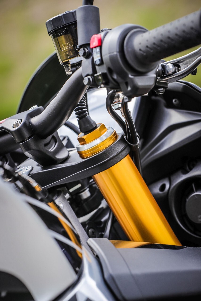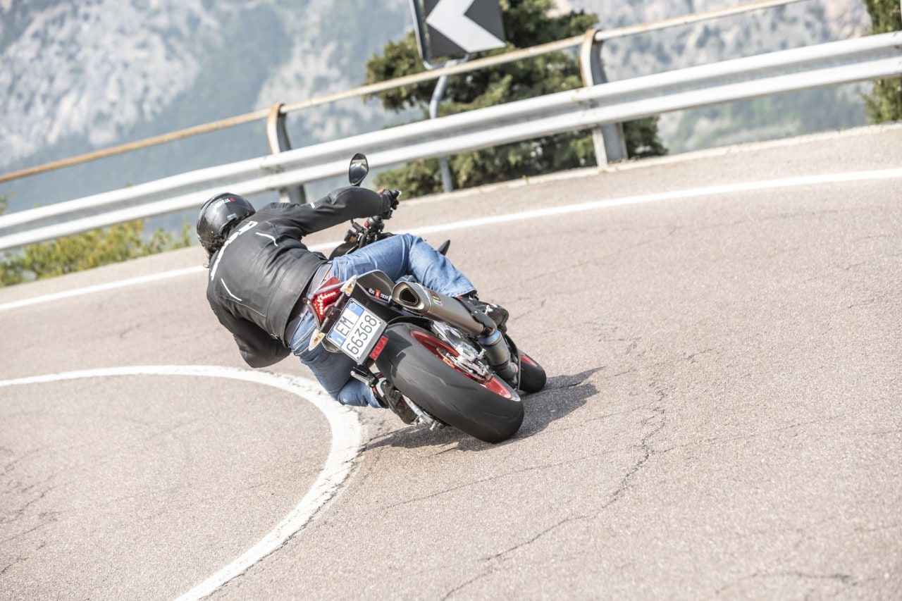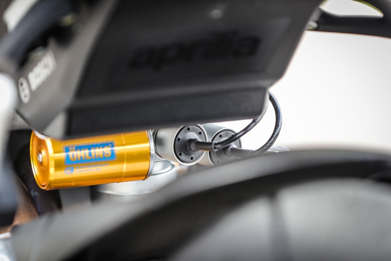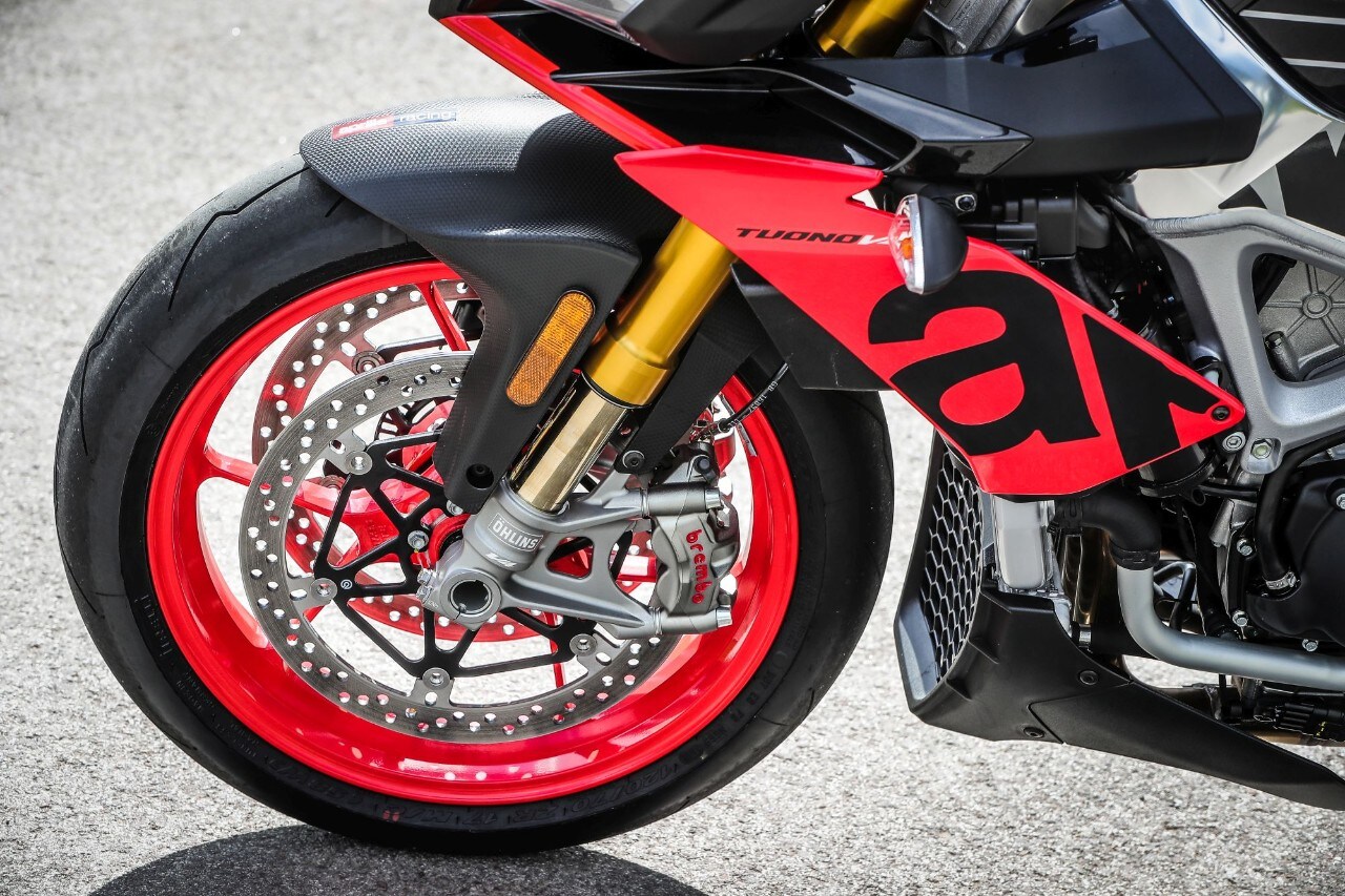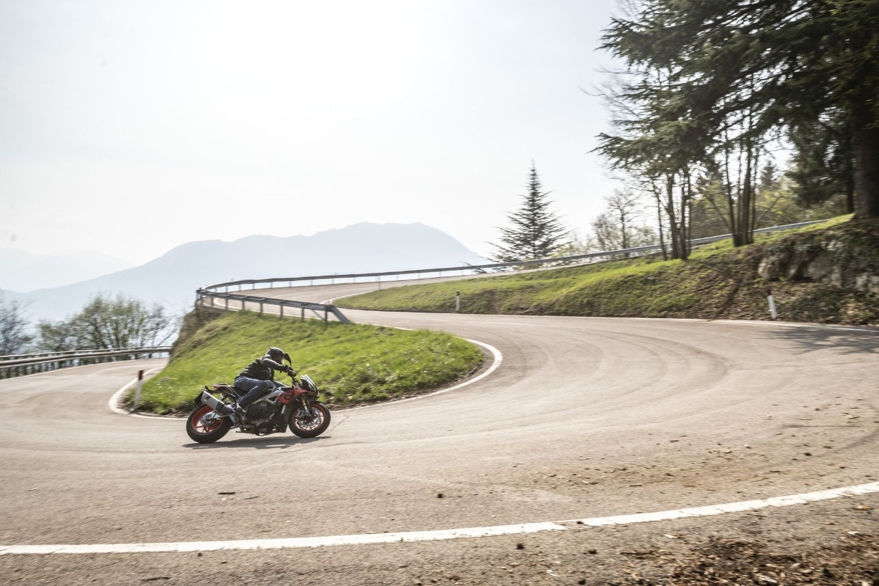 Destra, sinistra e ancora destra, l'agilità non manca e i 209 kg in ordine di marcia svaniscono. Ma soprattutto la Tuono trasmette fiducia, tanta fiducia, grazie all'avantreno granitico, dove il binomio sospensioni elettroniche Öhlins Smart EC 2.0e pneumatici Pirelli Diablo Supercorsa SP merita un 10 e lode. Svelta e allo stesso tempo progressiva e intuitiva, grazie anche all'ammortizzatore di sterzo elettronico, la naked italiana punta alla corda di ogni curva senza incertezze, con la forcella che affonda nel primo tratto per poi diventare più solida. Le regolazioni sono molto sensibili, così basta cambiare mappa o modificare i parametri di partenza (potete anche impostarla in "manuale" e agire sui settaggi come fosse una forcella tradizionale, perdendo, ovviamente, l'adattamento automatico dell'idraulica) per ricercare maggiore sostegno o comfort, ma senza rinunciare alla scorrevolezza sulle imperfezioni facendoti sentire la ruota anteriore in mano. Il mono ha invece una taratura di base più dura, a vantaggio del grip e della neutralità della ciclistica quando si dà gas in uscita di curva.