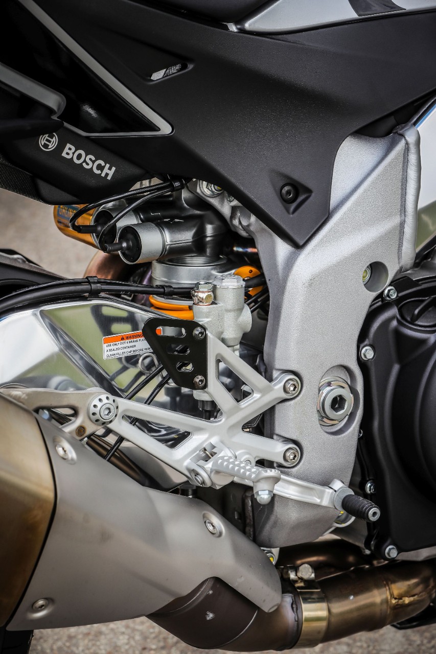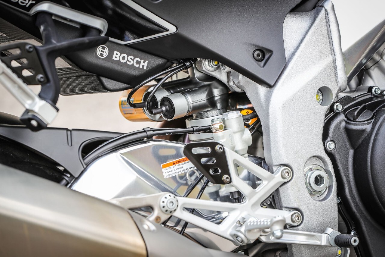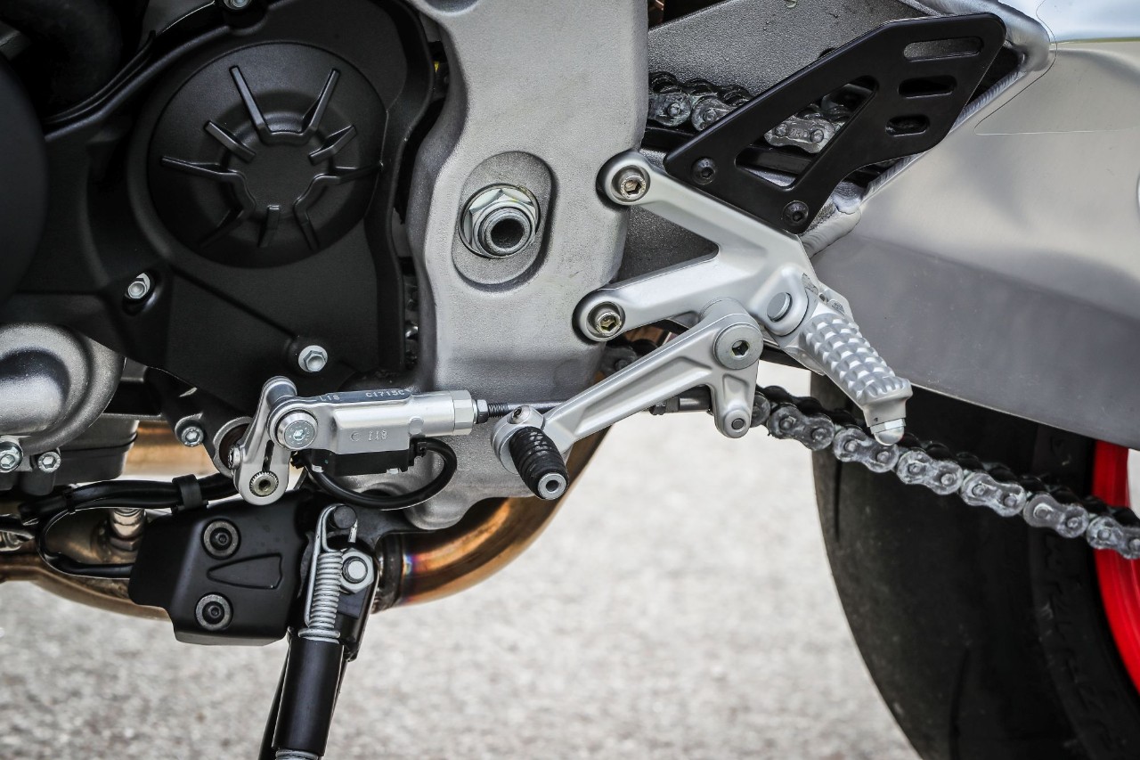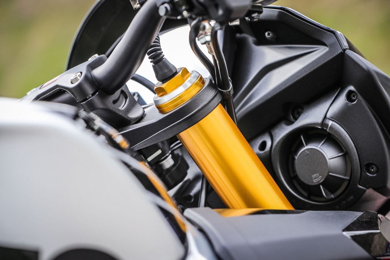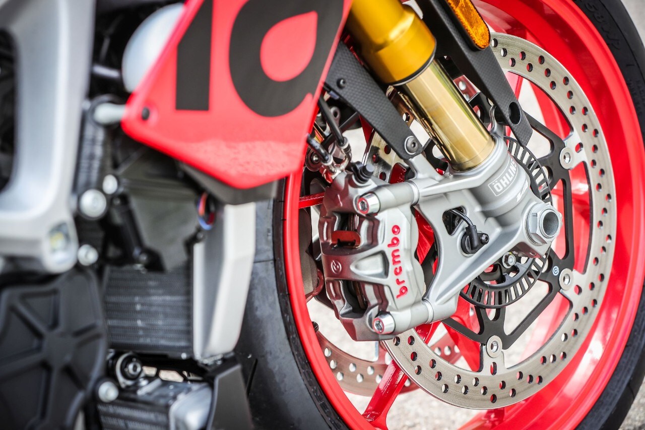 Destra, sinistra e ancora destra, l'agilità non manca e i 209 kg in ordine di marcia svaniscono. Ma soprattutto la Tuono trasmette fiducia, tanta fiducia, grazie all'avantreno granitico, dove il binomio sospensioni elettroniche Öhlins Smart EC 2.0e pneumatici Pirelli Diablo Supercorsa SP merita un 10 e lode. Svelta e allo stesso tempo progressiva e intuitiva, grazie anche all'ammortizzatore di sterzo elettronico, la naked italiana punta alla corda di ogni curva senza incertezze, con la forcella che affonda nel primo tratto per poi diventare più solida. Le regolazioni sono molto sensibili, così basta cambiare mappa o modificare i parametri di partenza (potete anche impostarla in "manuale" e agire sui settaggi come fosse una forcella tradizionale, perdendo, ovviamente, l'adattamento automatico dell'idraulica) per ricercare maggiore sostegno o comfort, ma senza rinunciare alla scorrevolezza sulle imperfezioni facendoti sentire la ruota anteriore in mano. Il mono ha invece una taratura di base più dura, a vantaggio del grip e della neutralità della ciclistica quando si dà gas in uscita di curva.