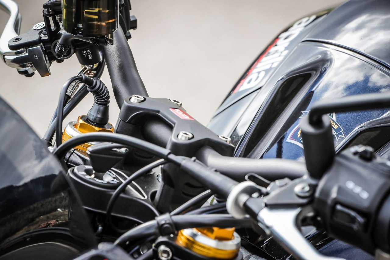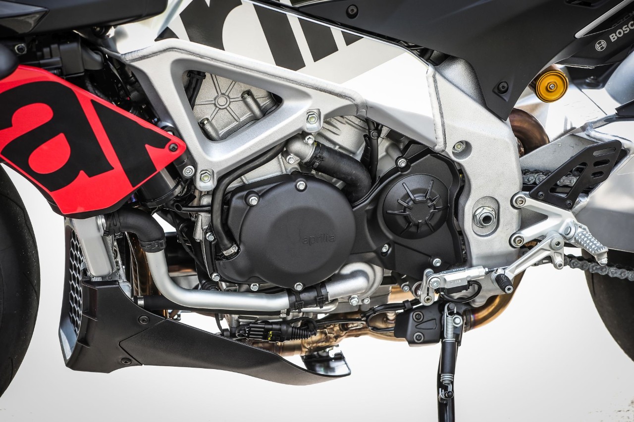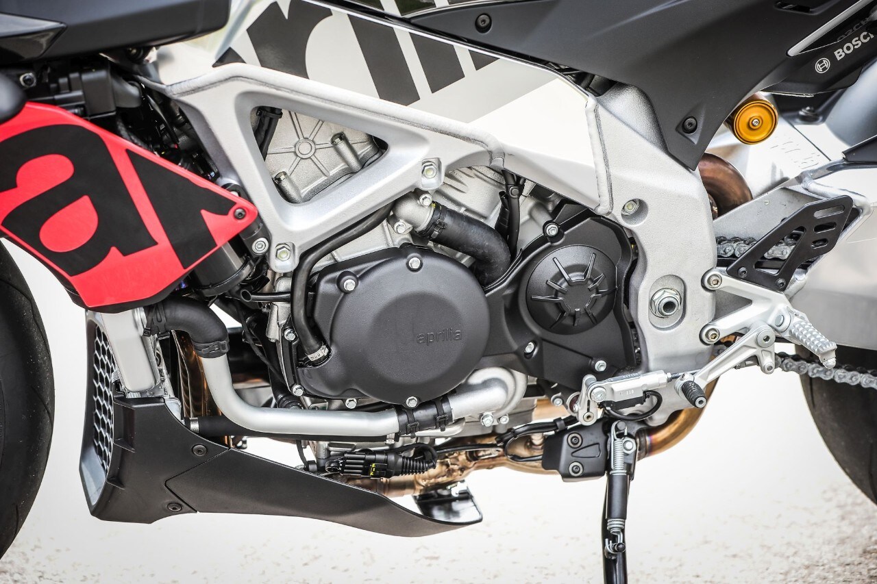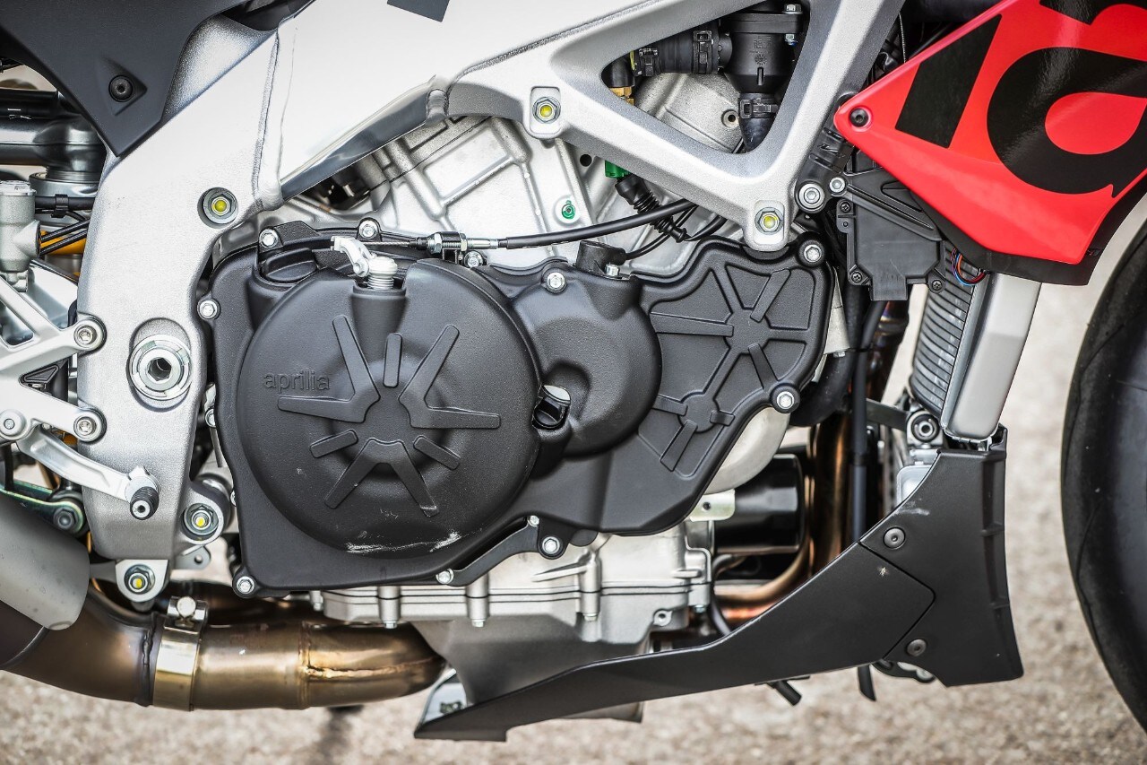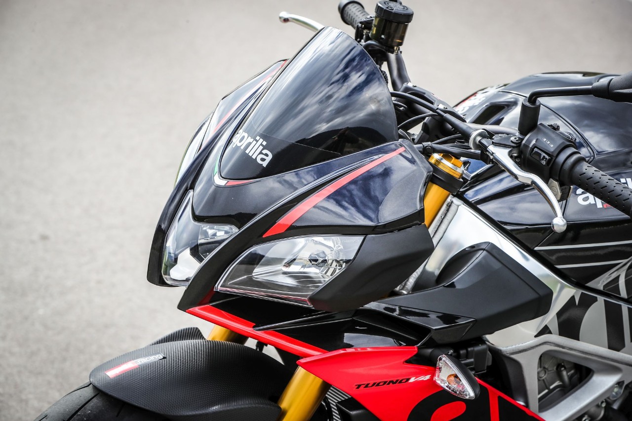 Perché è un sogno guidare la Tuono: a parte la KTM 1290 Super Duke R, non c’è moto paragonabile alla streetfighter italiana: telaio doppia trave e forcellone entrambi in alluminio che trasmettono forza e hanno quel non so che da reparto corse. Poi c'è il codino, compatto e filante sparato verso il cielo, il manubrio largo da stringere come le corna di un toro e, sopra a tutto, quel diavolo di V4 di 65° da 1.077 cc: un motore che per la Tuono tira fuori 175 CV e 121 Nm di coppia massima, ma che sulla sorella RSV4 1100 Factory arriva addirittura a 217 CV! Tanta roba. Ma anche troppa per tanti e, soprattutto, per molte delle nostre strade, strette, malconce, trafficate, sporche e non sempre scorrevoli, dove si finisce per guidare con poca fluidità tra un’accelerata in uscita di curva e una staccata in ingresso. Per noi umani, sfruttare l’enorme potenziale del propulsore è impensabile se non chiudendo le strade al traffico e il cervello: in ogni marcia la Tuono sfoggia un’elasticità da spavento (una leggera incertezza quando si riprende il gas al minimo nelle marce alte), la lancetta scala rapida la parete del contagiri nonostante i rapporti lunghetti e in un amen ci si ritrova a volare, accompagnati dallo scoppiettio dello scarico a ogni inserimento di marcia. Anche se a dare libidine è la doppietta in scalata, grazie anche a un quickshift preciso e svelto come quello di una superbike. Anche la prima entra bene.
