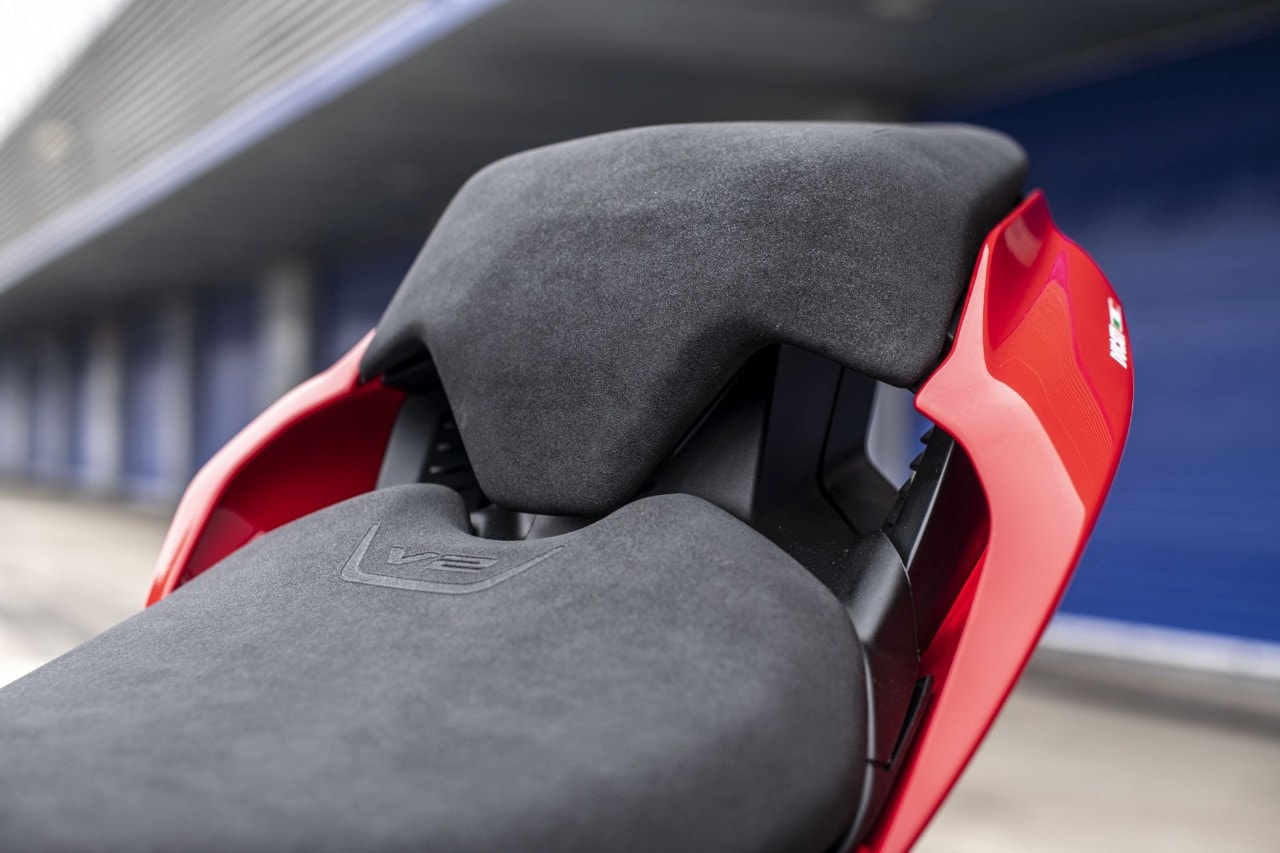Sulla V2 debutta anche il quickshifter bidirezionale, il monobraccio in alluminio, uno scarico sotto motore che quasi non si vede (ma si sente) e una carenatura pulitissima dove, nella zona anteriore, sbuca la voluminosa presa d’aria incorniciata dalle luci a led.