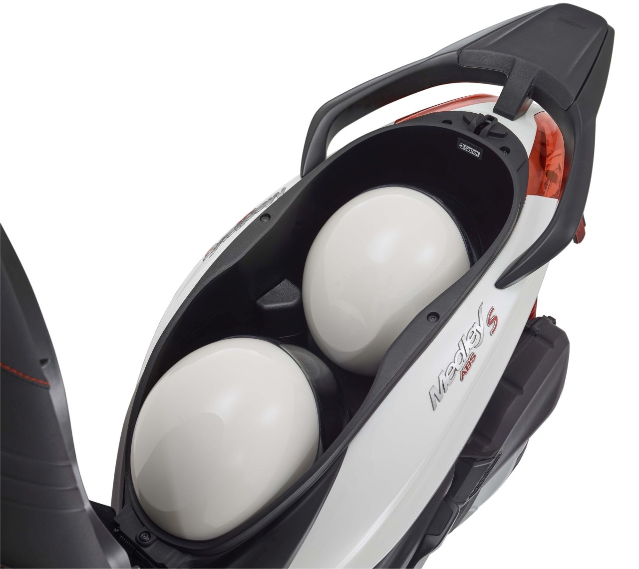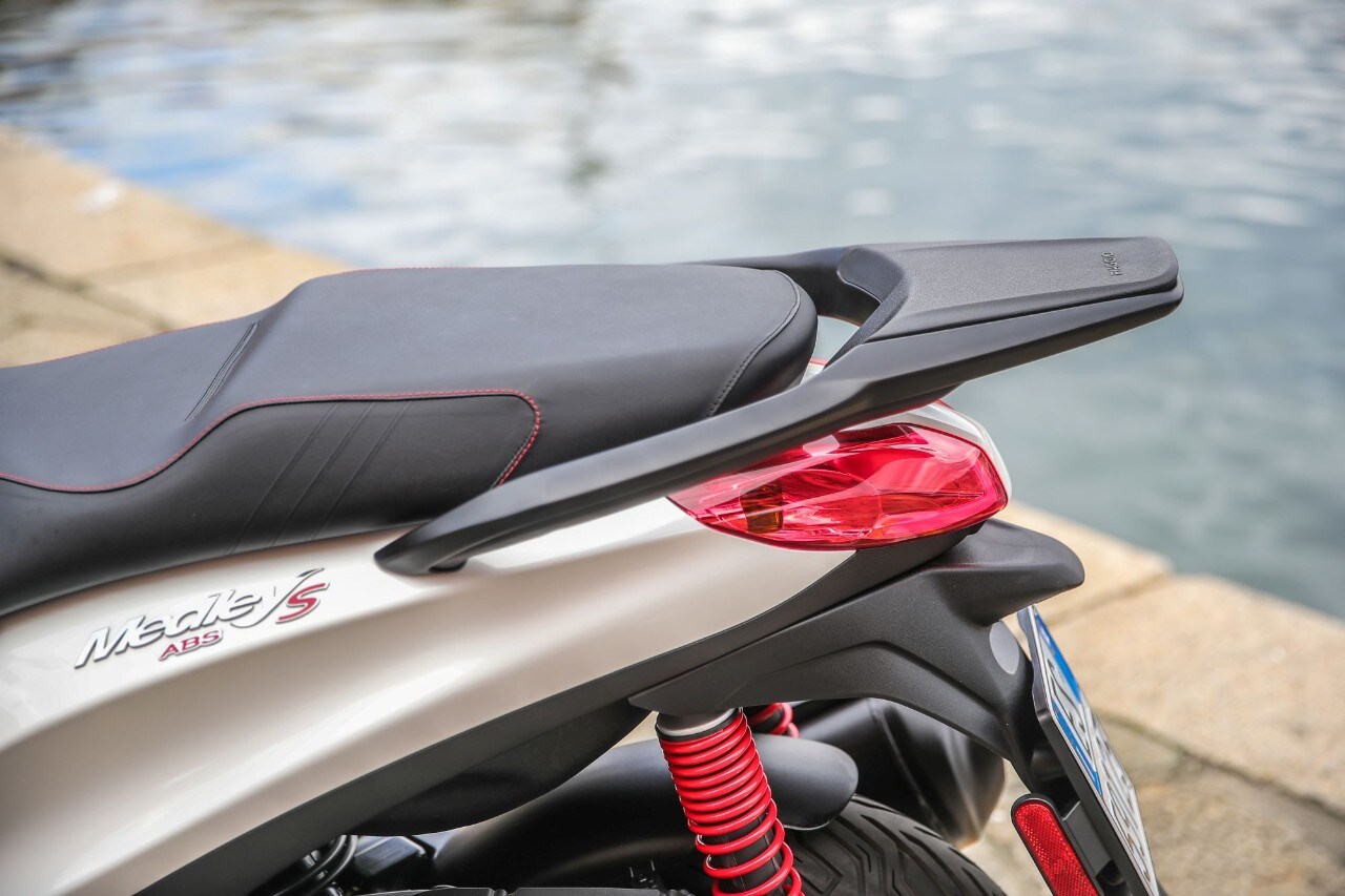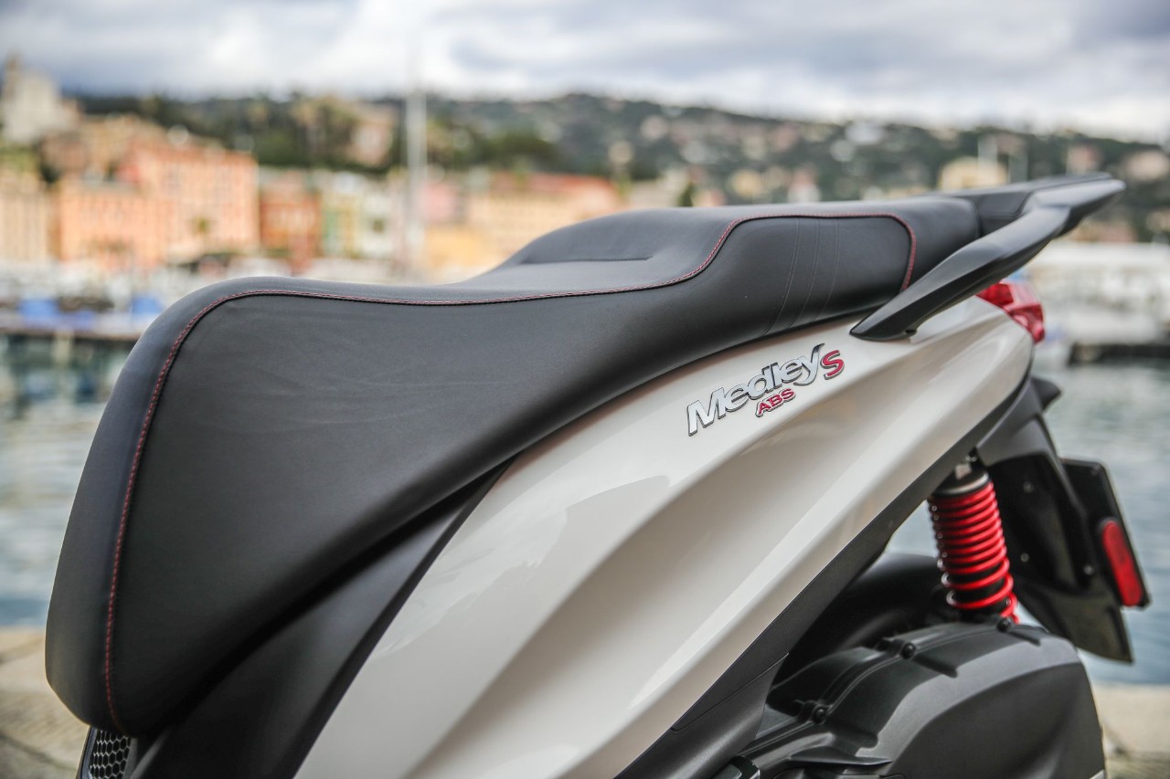 La sella è stata rivista, mentre è rimasto invariato lo spazio del vano sotto la seduta, 36 litri che tradotto vuol dire che vi si possono sistemare due caschi integrali; inoltre per sollevare la sella basta premere il pulsante nel retroscudo che sblocca la serratura. La pedana è ampia e per fissare uno zaino c'è il gancio portaborse. Comodo anche il cassettino nel retroscudo dotato di presa USB e in grado di contenere uno smartphone di medie dimensioni. Di serie anche la piastra portapacchi su cui volendo si può montare il bauletto disponibile da 32 e 37 litri. Sul nuovo Medley arrivano anche nuovi cerchi (anteriore da 16" posteriore da 14"), è stata rivista la taratura della forcella e al posteriore oltre ai nuovi ammortizzatori troviamo un pneumatico posteriore più largo 120/70-14".