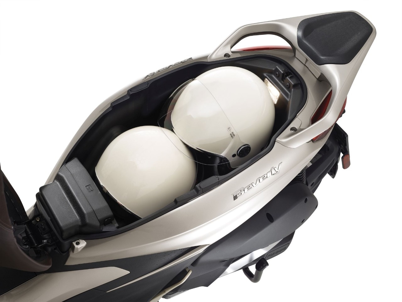 Il bauletto 36 litri, verniciato in tinta con il veicolo e dotato di schienalino comfort incorporato realizzato nello stesso colore e materiale della sella, può contenere un casco integrale o un casco full jet con visiera.