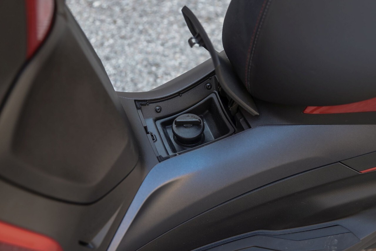 Parlando di capacità di carico sotto la sella il vano è più ospitale di prima e c'è spazio per un integrale di medie dimensioni o per due caschi jet, comoda la luce di cortesia. Nel retroscudo c'è un altro cassettino, qui c'è la presa USB che possiamo usare per caricare il nostro smartphone nei trasferimenti. Sul Beverly di serie c’è il portapacchi che integra le maniglie del passeggero. Sopra il tunnel si può sistemare uno zainetto fissandolo al gancio portaborse.