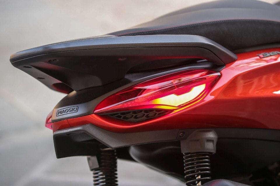 Sul Beverly la qualità costruttiva era già alta, ma qui ha fatto un passo avanti, basta guardare la cura nelle verniciature e negli accoppiamenti, le texture con i piccoli esagoni (fra cui nascosto c’è anche un piccolissimo logo Piaggio), le finiture della sella, con doppio rivestimento e doppie cuciture e due livelli di seduta separati per conducente e passeggero, o i nuovi cerchi a sette razze sdoppiate, per rendersi conto.