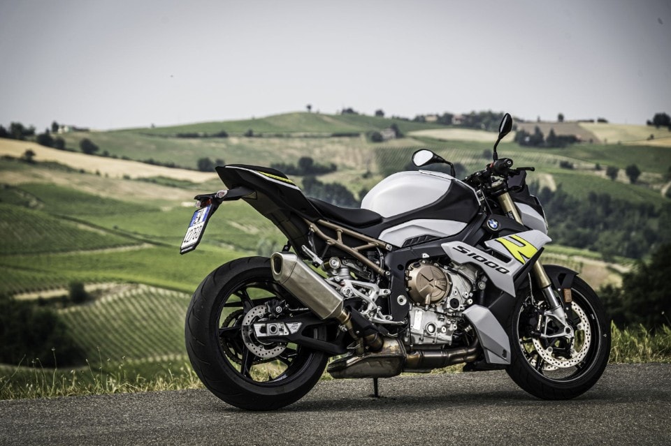 Il forcellone deriva da quello della S 1000 RR ed è abbinato a un ammortizzatore posizionato più lontano dal motore, per scongiurare rischi di surriscaldamento e regalare una più costante regolarità di funzionamento. L’elettronica vede una nuova piattaforma inerziale (a 6 assi) e fornisce di serie tutto quel che serve per potersi divertire in sicurezza con traction control, ABS Pro e tre modalità di guida preimpostate, Dynamic, Road e Rain. Volendo mettere mano al portafoglio, si può inoltre pescare nella ricca gamma di optional elettronici tra i quali il Riding Mode “Pro” che arricchisce la S 1000 R dell’Engine Brake con controllo elettronico della coppia di trascinamento. Tutto ampiamente personalizzabile. Le regolazioni sono facilmente gestibili grazie al multi controller presente sul lato sinistro del manubrio e consultabili sul nuovo pannello TFT a colori da 6,5”. E il design, vi starete domandando? Anche lì è stato fatto un bel lavoro, rendendo la S 1000 R più fresca con un nuovo faro anteriore full LED che accresce il family feeling con altri modelli della Casa dell’elica e un posteriore più sottile, con il telaietto a traliccio lasciato quasi completamente a vista. Intrigante la vista posteriore, dove le frecce a LED hanno anche funzione di luce di posizione.