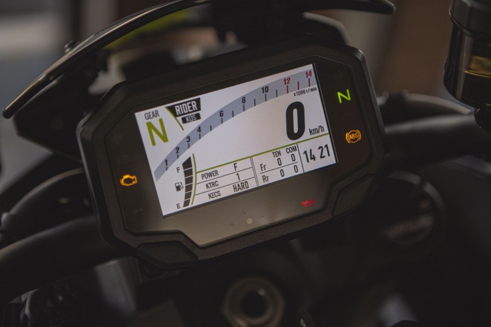 Lo snello telaio a traliccio, scelto anche per migliorare la dissipazione di calore del motore, ospita quest’ultimo in posizione pressoché verticale, e in funzione parzialmente portante. La forcella Showa SFF-CA da 43 mm e il mono BFRC lite sono gestiti dall’algoritmo semiattivo EERA integrato nella organizzazione globale dell’elettronica di bordo KCMF, che prevede tre riding mode più uno personalizzabile e coordina il controllo di trazione, il launch e wheelie control e la frenata, tutti cornering. La filosofia di Kawasaki è di ridurre la pletora di regolazioni possibili al minimo, per cui anche la pulsantiera sui due bracciali e il TFT da 4,3” sono meno esuberanti rispetto alle concorrenti.