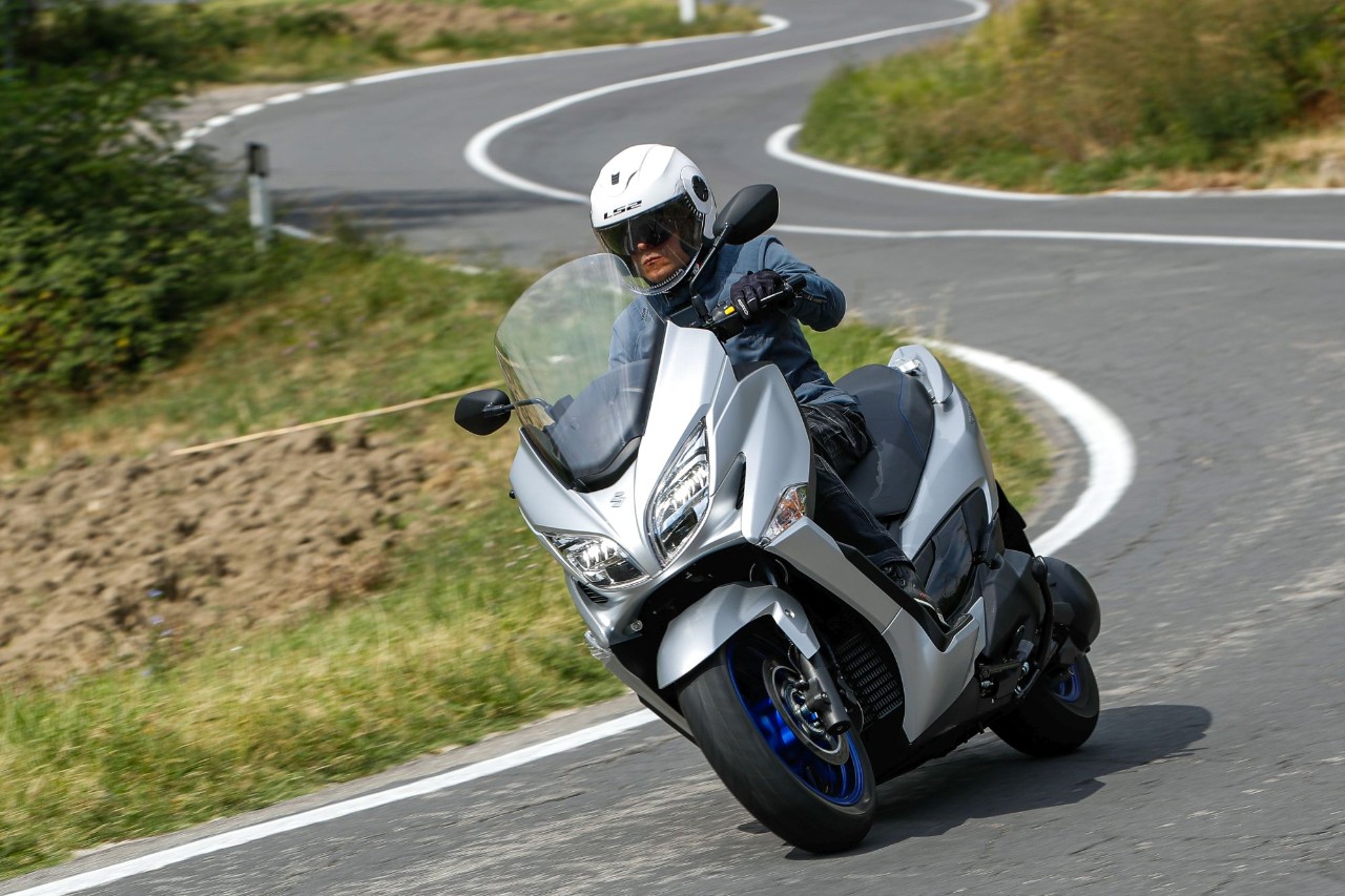 Il Suzuki pesa 218 kg in ordine di marcia, ma è ben bilanciato e facile da gestire anche nelle manovre da fermo, dove la sella ben conformata nella parte centrale e la pedana stretta consentono a tutti di appoggiare i piedi a terra. Nel traffico per essere un midi si rivela a suo agio. Ha il baricentro basso, è agile nello slalom e si riescono a fare manovre e inversioni in spazi ristretti grazie al raggio di sterzata ridotto.
